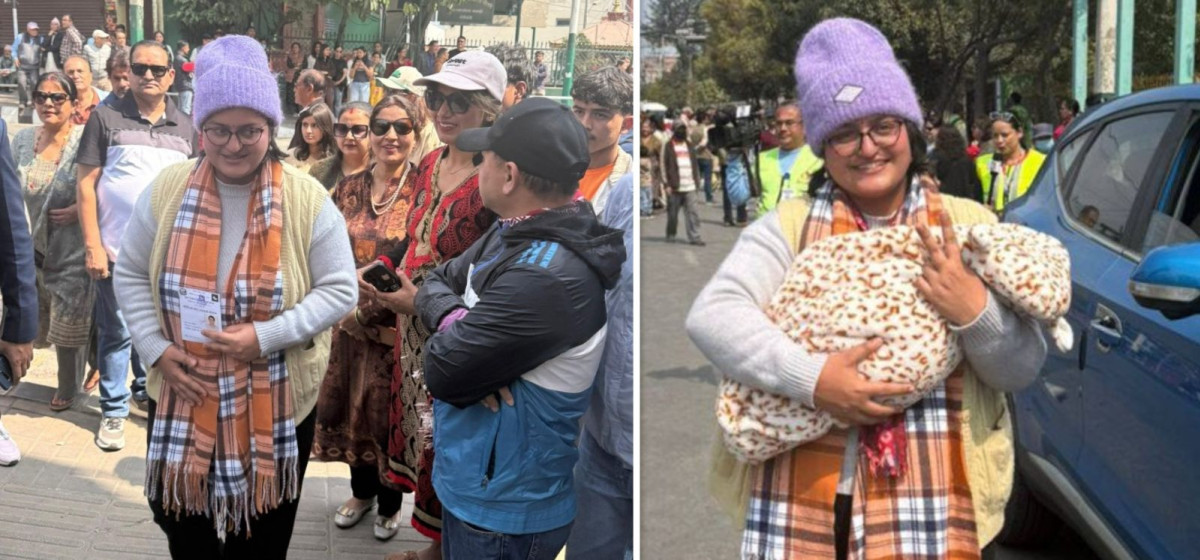 काठमाडौँ क्षेत्र नम्बर १ की उम्मेदवार रञ्जु दर्शना नवजात शिशुलाई लिएरै मतदान गर्न पुगेकी छन्।