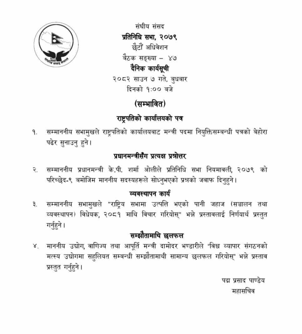 बैठकमा राष्ट्रिय सभामा उत्पति भएको पानी जहाज (सञ्चालन तथा व्यवस्थापन) विधेयक, २०८१ टेबल हुने कार्यसूची छ । यस्तै उद्योग, बाणिज्य तथा आपूर्ति मन्त्री दामोदर भण्डारीले विश्व व्यापार संगठनको मत्स्य उद्योगमा सहुलियत सम्बन्धी सम्झौतामाथि सामान्य छलफल गरियोस भन्ने प्रस्ताव पेस गर्ने सम्भावित कार्यतालिका रहेको महासचिव पद्यप्रसाद पाण्डेयद्वारा जारी सम्भावित कार्यसूचीमा उल्लेख छ ।