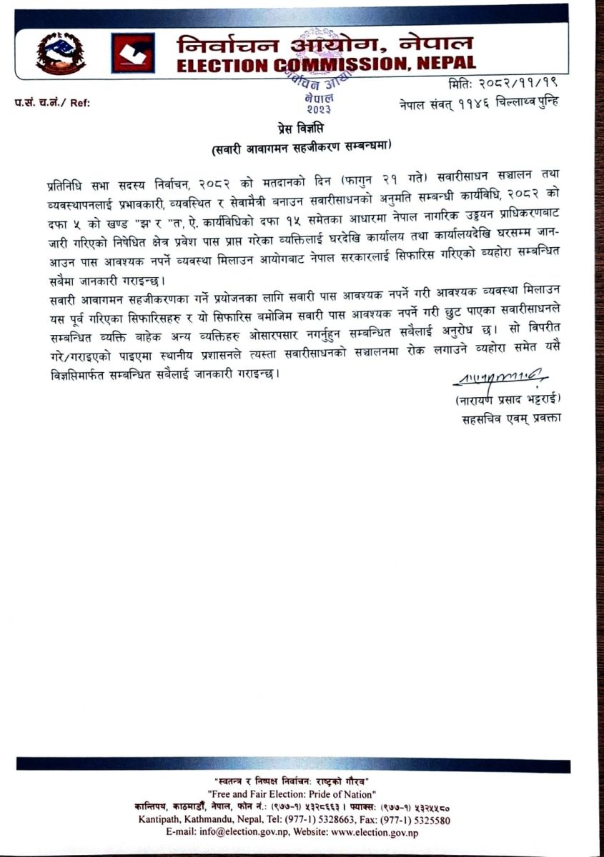 भोलि हुने प्रतिनिधि सभाको निर्वाचनका लागि सवारी आवागमन व्यवस्थापनलाई सहजीकरण गर्न निर्वाचन आयोगले विशेष व्यवस्था सिफारिस गरेको छ।