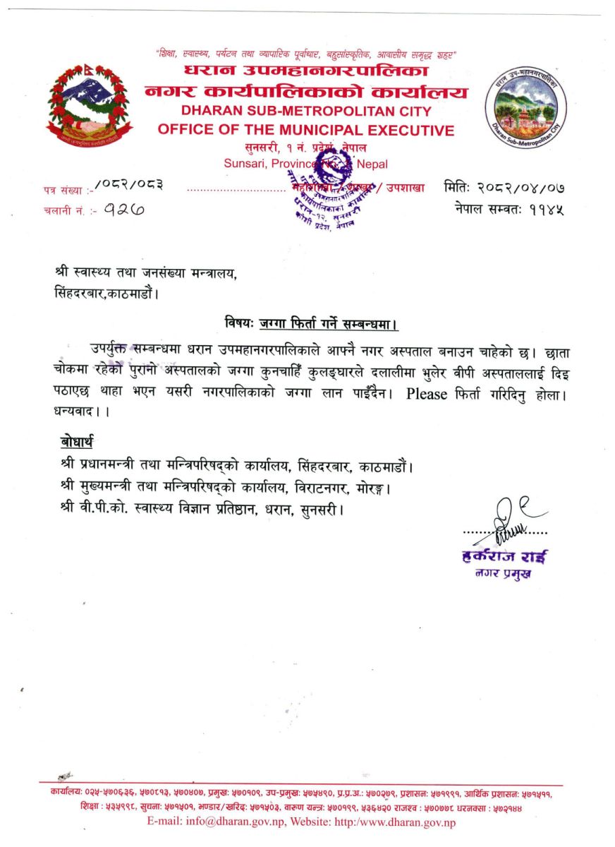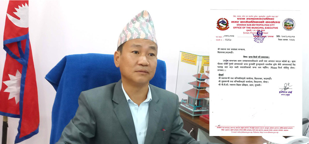 धरान उपमहानगरपालिकाका प्रमुख हर्कराज राई (साम्पाङ) ले धरानको छाता चोकस्थित पुरानो अस्पतालको जग्गा फिर्ता गर्न स्वास्थ्य तथा जनसंख्या मन्त्रालयलाई पत्र लेखेका छन्।