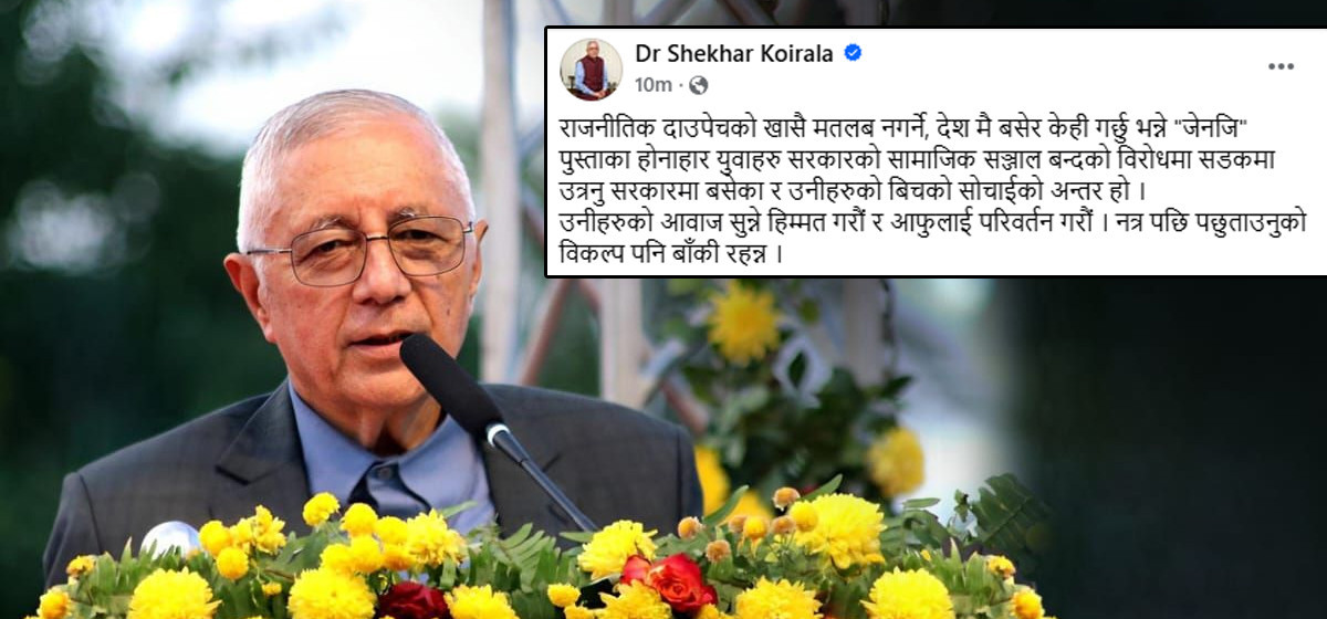 ‘राजनीतिक दाउपेचको खासै मतलब नगर्ने, देशमै बसेर केही गर्छु भन्ने ‘जेन–जी’ पुस्ताका होनहार युवाहरू सरकारको सामाजिक सञ्जाल बन्दको विरोधमा सडकमा उत्रनु सरकारमा बसेका र उनीहरूको बिचको सोचाइको अन्तर हो,’ कोइरालाले भनेका छन्, ‘उनीहरूको आवाज सुन्ने हिम्मत गरौं र आफूलाई परिवर्तन गरौं।’ नत्र पछि पछुताउनुको विकल्प पनि बाँकी नरहने उनले लेखेका छन्।