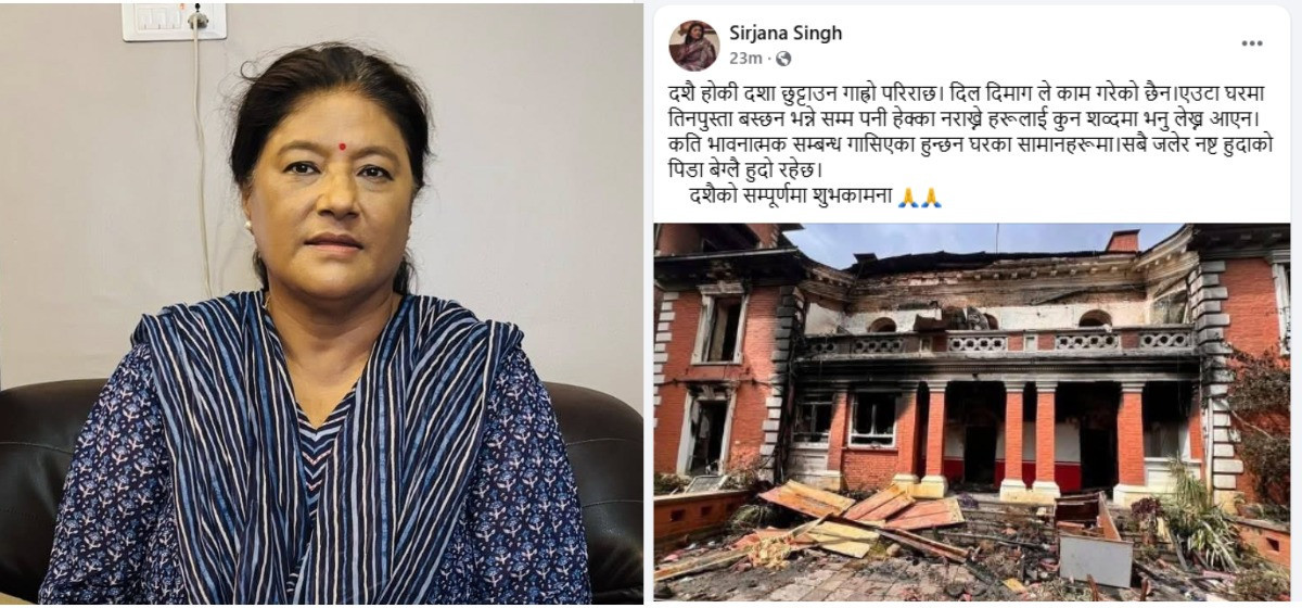 पूर्व उपप्रधानमन्त्री प्रकाशमान सिंहकी पत्नी सिर्जना सिंहले महाअस्टमीको दिन(मंगलबार) फेसबुकमा भावुक स्टाटस राखेकी छन्। २०४६ सालको जनआन्दोलनका सर्वोच्च कमान्डर स्व. गणेशमान सिंहकी बुहारी पनि रहेकी सिंहले क्षतिग्रस्त चाक्सीबारीको घरको तस्बिर राख्दै दुखेसो पोखेकी हुन्।