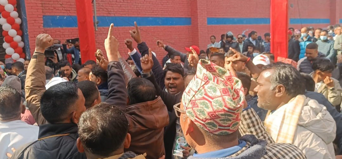 नेपाली कांग्रेसको विशेष महाधिवेशन भइरहेको भृकुटीमण्डपमा प्रतिनिधिहरूले नाराबाजी गरेका हुन्। प्रतिनिधिहरूले केन्द्रीय कार्यसमिति भङ्ग गर, नयाँ नेतृत्व चयन गर जस्ता नारा लगाउँदै विरोध जनाएका हुन्।