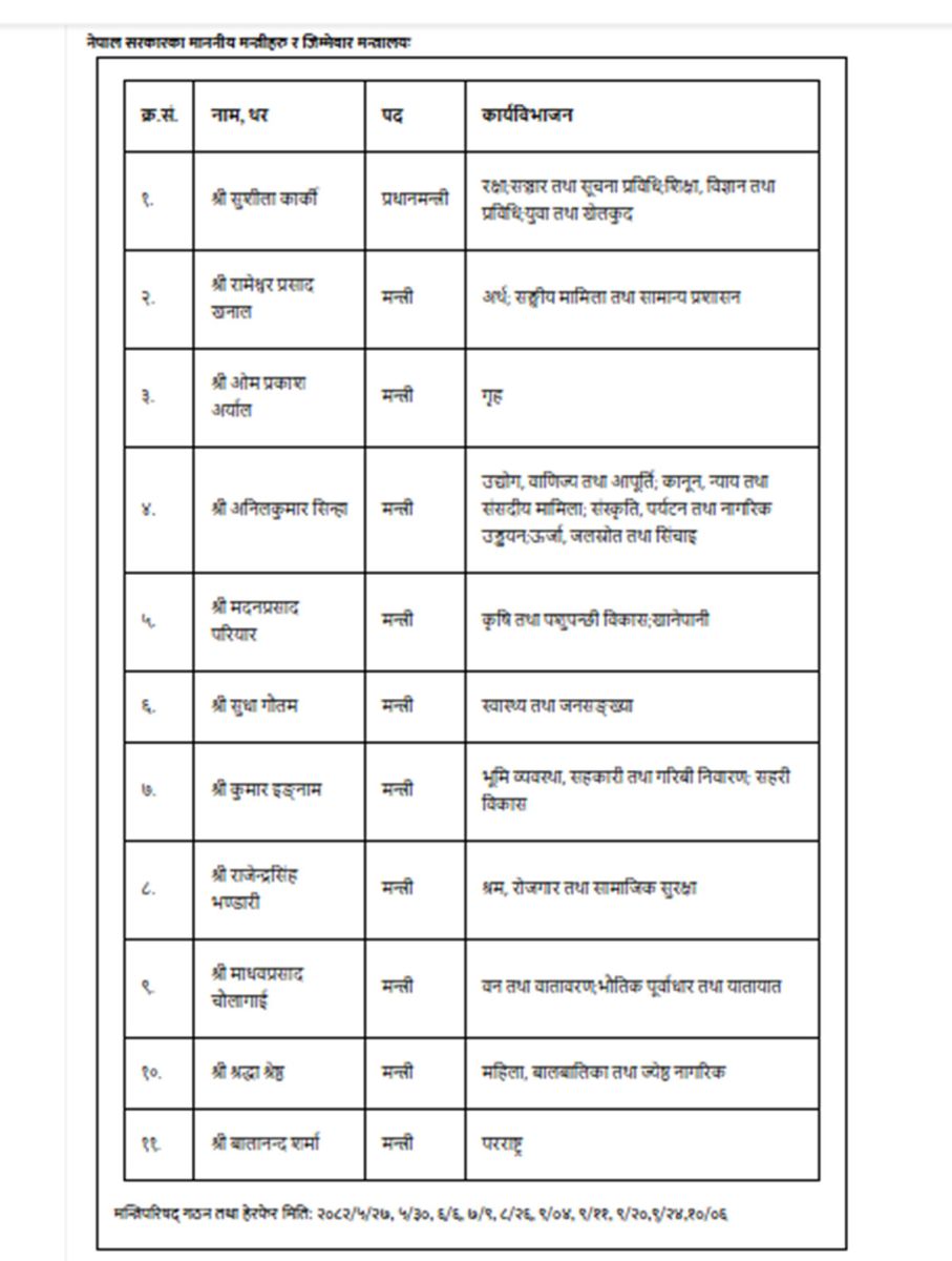 मन्त्रिपरिषदमा अब प्रधानमन्त्रीबाहेक १० मन्त्री छन् । अर्थमन्त्री रामेश्वर खनालको काँघमा संघीय मामिला तथा सामान्य प्रशासन मन्त्रालयको जिम्मेवारी थपिएको छ ।
