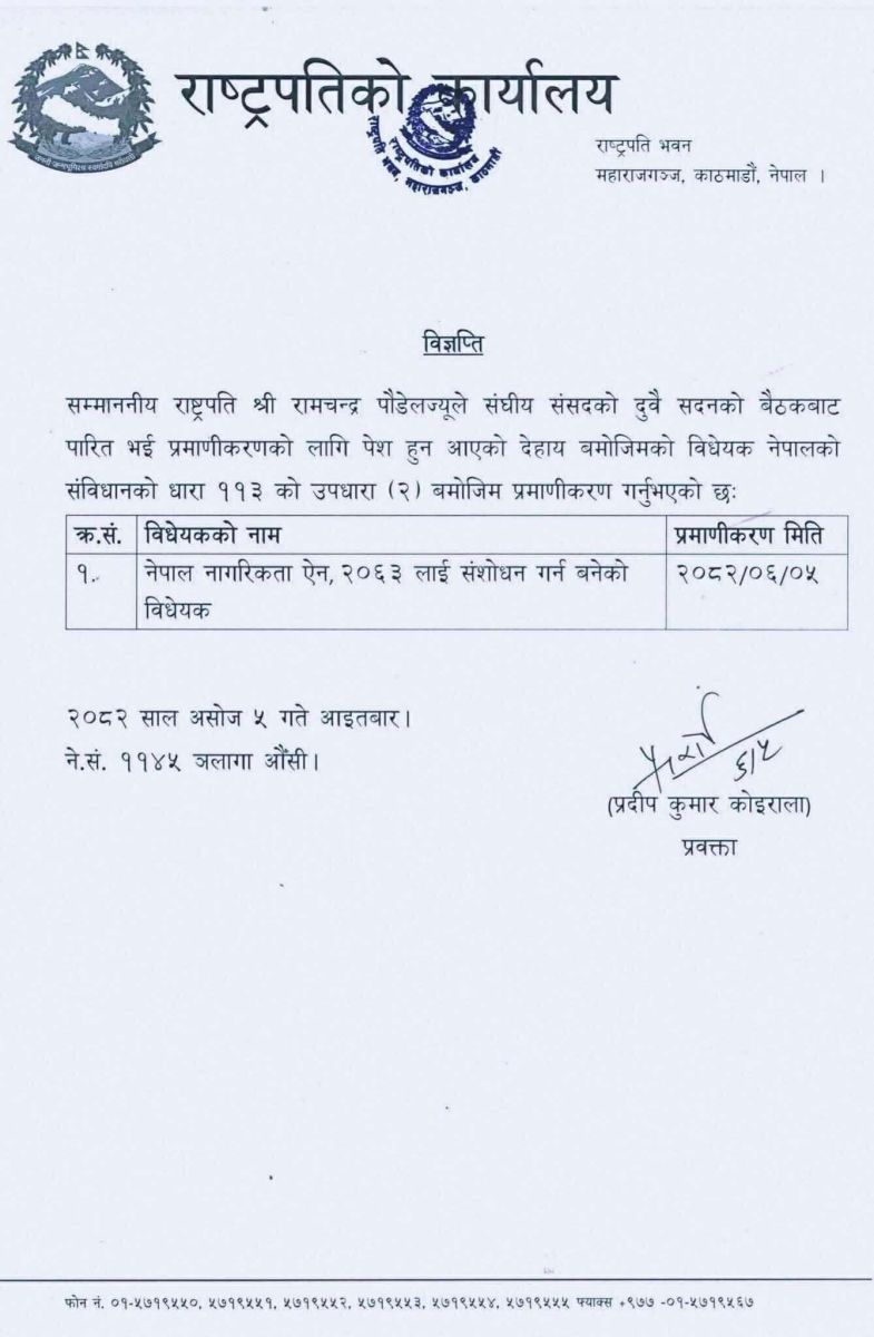 राष्ट्रपति रामचन्द्र पौडेलले नेपाल नागरिकता ऐन, २०६३ लाई संशोधन गर्न बनेको विधेयक प्रमाणीकरण गरेका छन् ।