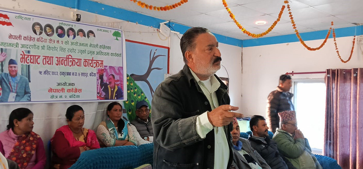कांग्रेसको बर्दिया, क्षेत्र नम्बर–२ कार्यसमितिले ठाकुरबाबा नगरपालिकाको साईपुरमा आज आयोजना गरेको भेटघाट तथा अन्तरक्रिया कार्यक्रमलाई सम्बोधन गर्दै सहमहामन्त्री राठौरले कांग्रेसले चुनावको तयारी थालेको तर शान्तिसुरक्षाको आवश्यक व्यवस्था हुन नसकेको बताए। उनले निर्वाचन सुनिश्चित गर्न सरकारले सुरक्षा लगायतका प्रबन्ध तत्काल गर्नुपर्नेमा जोड दिए।