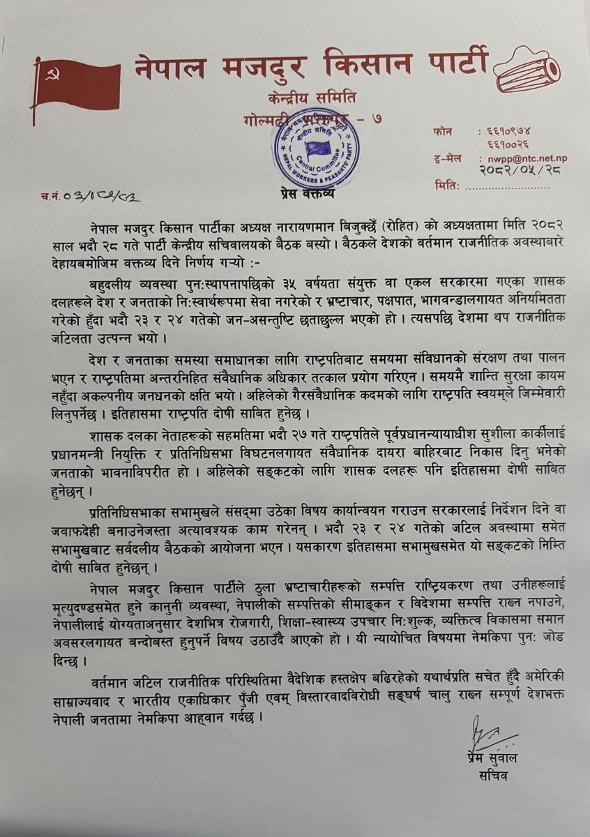 नेपाल मजदुर किसान पार्टी (नेमकिपा) ले पूर्वप्रधानन्यायाधीश सुशीला कार्की नेतृत्वको वर्तमान सरकारलाई संवैधानिक दायराबाहिरबाट गठन गरिएको दावी गर्दै त्यसको कडा विरोध जनाएको छ।