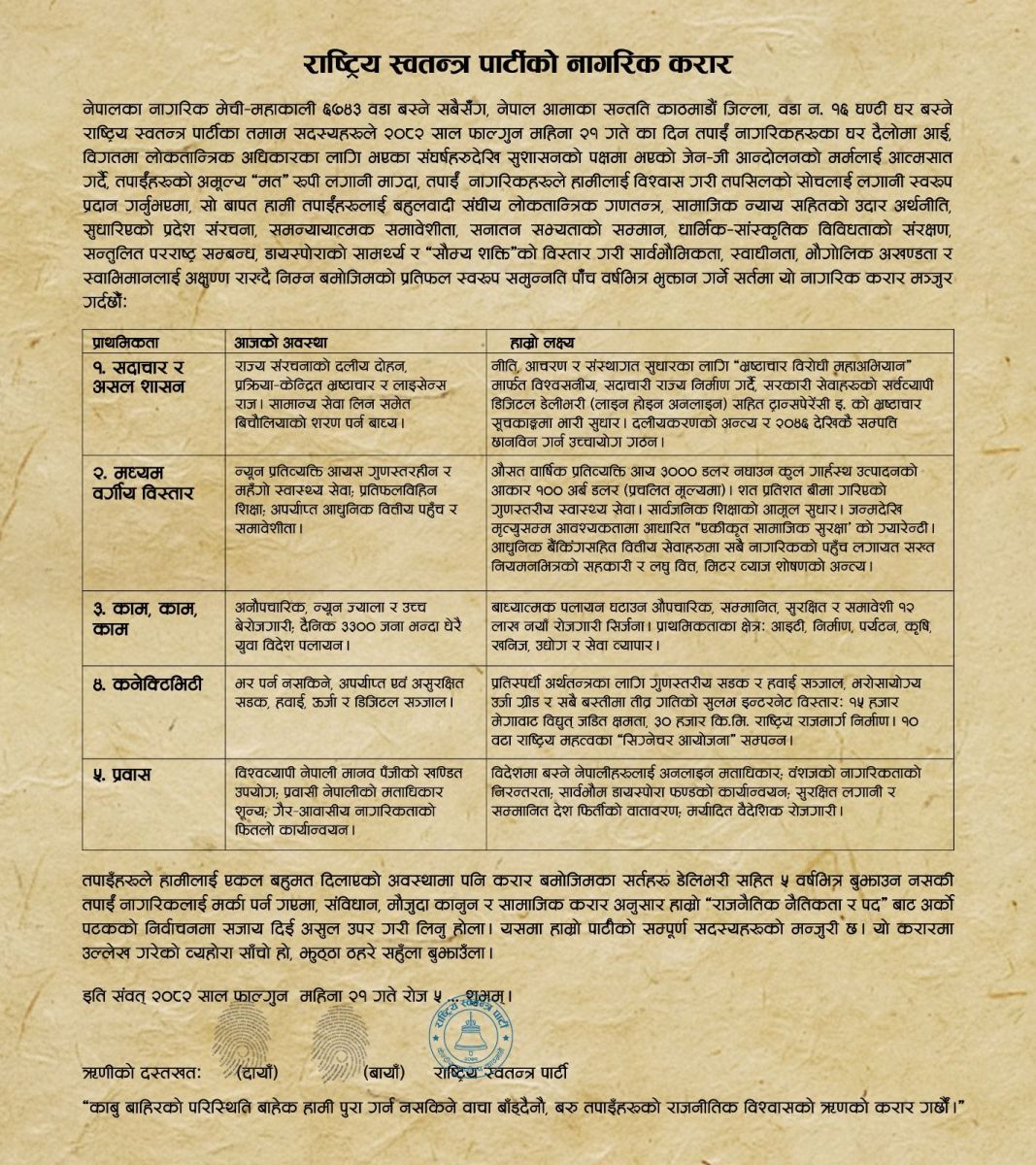 राष्ट्रिय स्वतन्त्र पार्टी (रास्वपा) का सभापति रवि लामिछानेले आगामी राजनीतिक कार्यदिशाका लागि जनतासँग ‘नागरिक करार’ सार्वजनिक गरेका छन्।