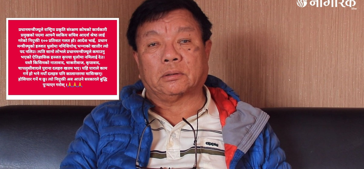 'प्रधानमन्त्रीज्यूले राष्ट्रिय प्रकृति संरक्षण कोषको कार्यकारी प्रमुखको पदमा आफ्नै स्वकीय सचिव आदर्श श्रेष्ठलाई गरेको नियुक्ति १०० प्रतिशत गलत हो,' उनले लेखे, 'आदर्श भाइ, प्रधान मन्त्रीज्यूको इज्जत धुलोमा नमिसियोस् भन्नाको खातीर त्यो पद नलिउ। त्यति सानो लोभले प्रधानमन्त्रीज्यूले कमाउनु भएको ऐतिहासिक इज्जत कृपया धुलोमा नमिलाई देउ।'