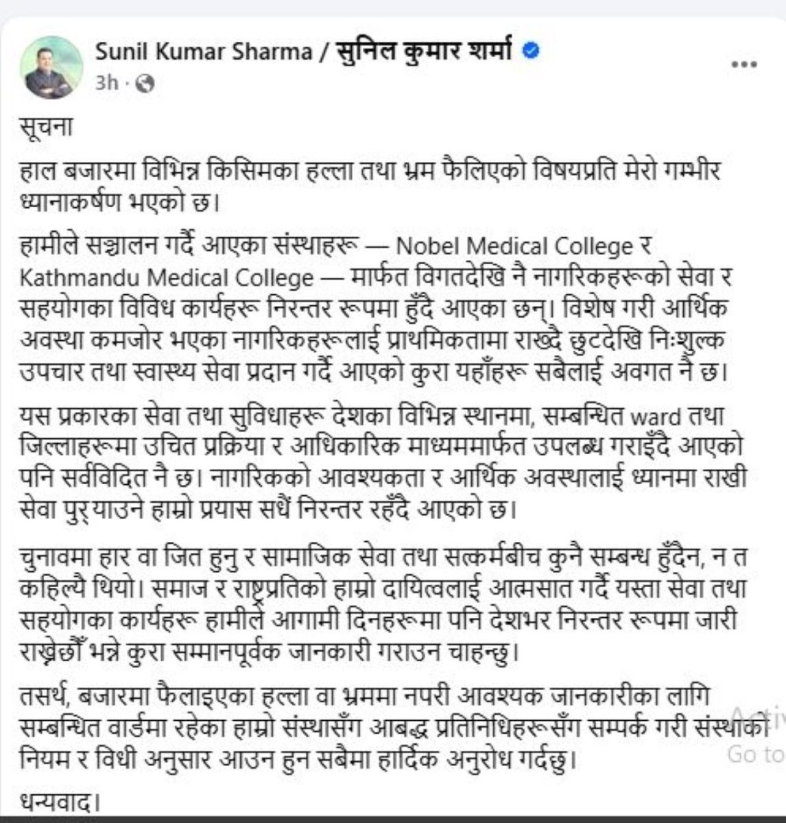 नेपाली कांग्रेसका नेता डा. सुनिल कुमार शर्माले चुनावमा पराजित भएपछि आफू आबद्ध अस्पतालले यसअघि दिँदै आएको स्वास्थ्य सेवा नदिने भएर फैलाइएका हल्लाप्रति आफ्नो ध्यानाकर्षण भएको बताएका छन्।