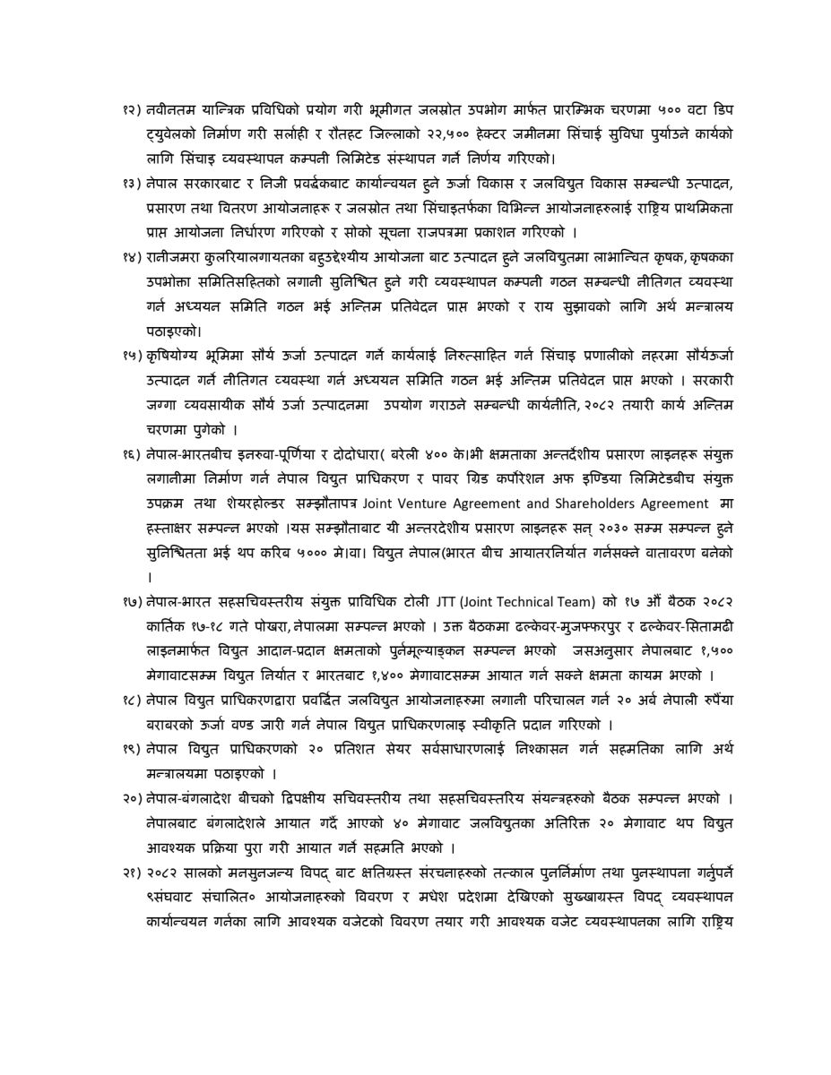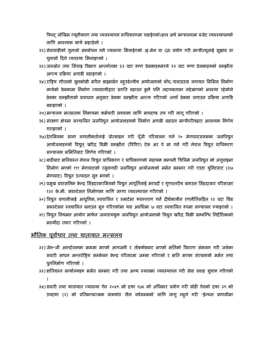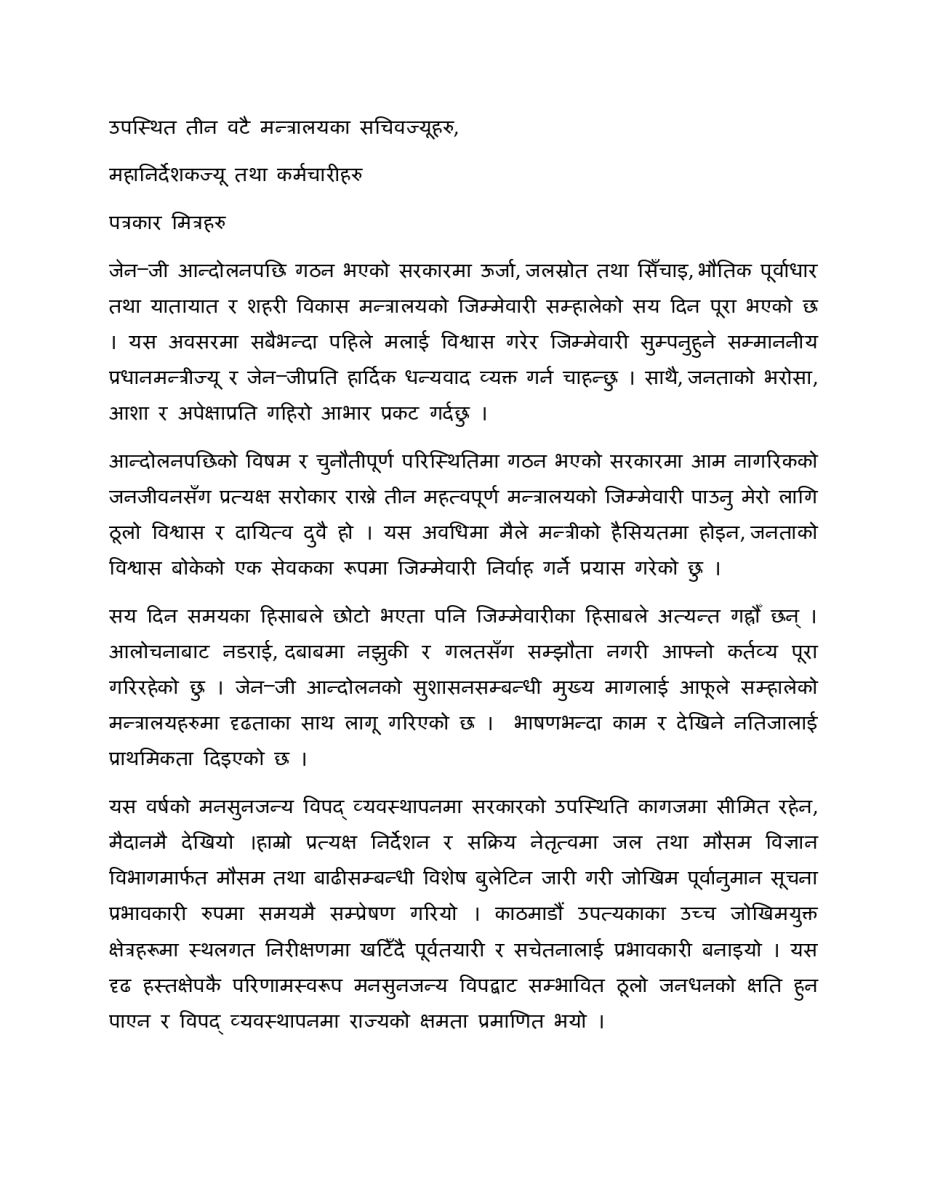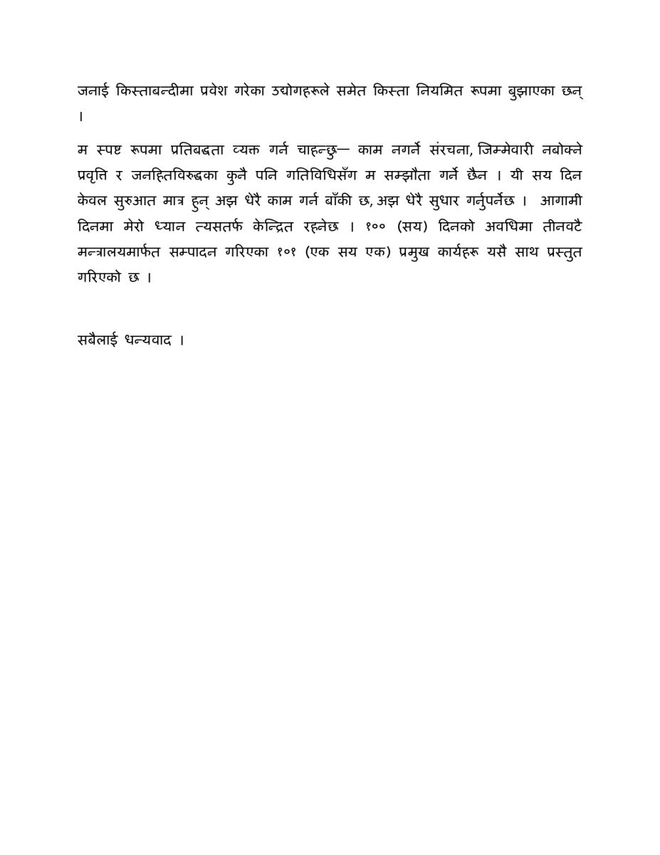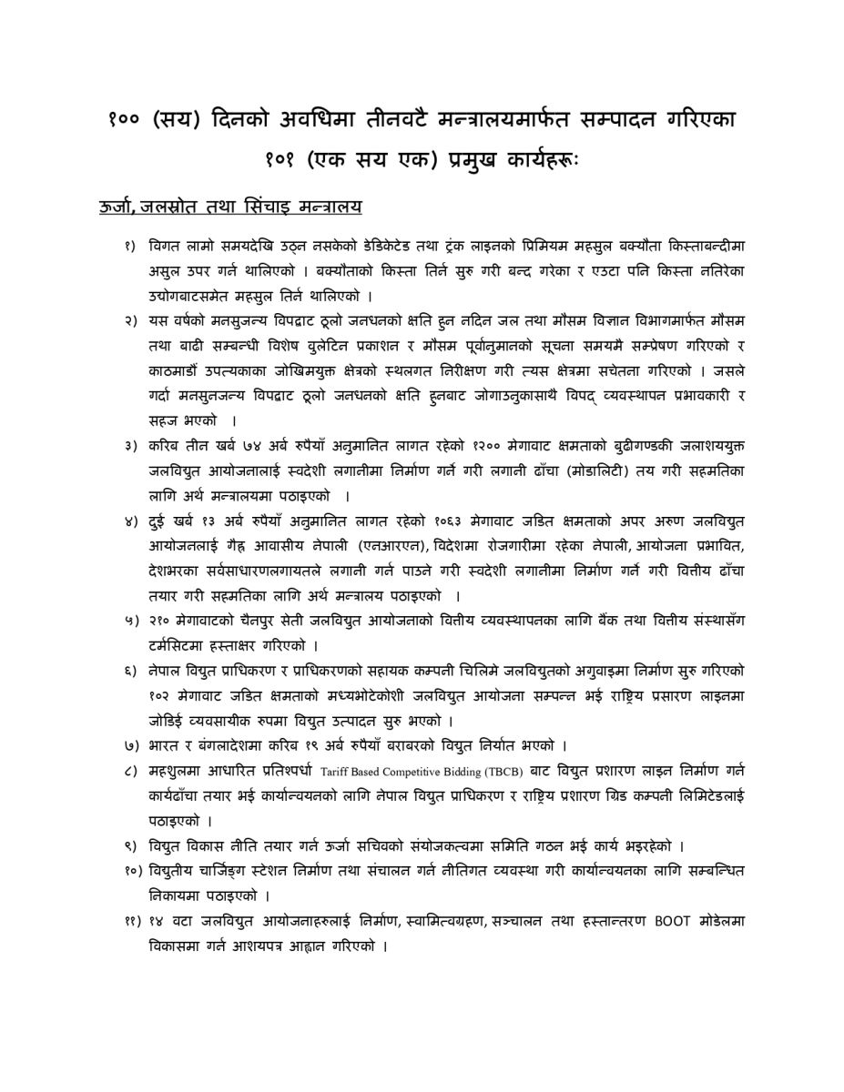 ऊर्जा, जलस्रोत तथा सिँचाइ मन्त्री कुलमान घिसिङले आफूले मन्त्रालय सम्हालेको १०० दिनका १०१ काम सार्वजनिक गरेका छन्। ऊर्जा मन्त्रालय, भौतिक पूर्वाधार तथा यातायात मन्त्रालय र सहरी विकास मन्त्रालय गरी तीन महत्त्वपूर्ण मन्त्रालय सम्हालेका घिसिङले बुधवार पत्रकार सम्मेलन गर्दै तीन वटै मन्त्रालयलेका १०१ प्रमुख काम सार्वजनिक गरेका हुन्।