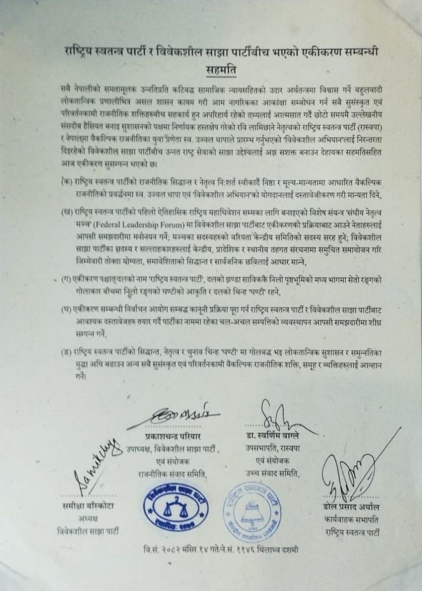 दुई दलबीच भएको सहमतिपत्रमा रास्वपाका तर्फबाट कार्यवाहक सभापति डोलप्रसाद अर्याल र उपाध्यक्ष डा. स्वर्णिम वाग्ले तथा विवेकशील साझाका तर्फबाट अध्यक्ष समीक्षा बाँस्कोटा र उपाध्यक्ष प्रकाशचन्द्र परियारले हस्ताक्षर गरेका छन्।