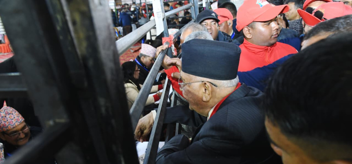 नेकपा (एमाले)को ११औं महाधिवेशनको बन्दसत्रमा अहिले उम्मेदवार मनोनयनको क्रम चलिरहेको छ। भृकुटीमण्डपमा जारी महाधिवेशनमा अध्यक्षमा केपी शर्मा ओलीले आफ्नो उम्मेदवारी दर्ता गराएका छन्। अध्यक्षका अर्का आकांक्षी ईश्वर पोखरेल मनोनयन दर्ताका लागि लाइनमा छन्। ईश्वरभन्दा ओलीले अघि नाम दर्ता गराएका हुन्।