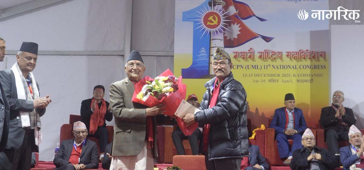 महाधिवेशन स्थल भृकुटीमण्डपमा आयोजित विशेष समारोहका बीच पार्टीको केन्द्रीय निर्वाचन आयोगका अध्यक्ष विजय सुब्बाले नवनिर्वाचित अध्यक्ष ओलीलाई शपथ गराएका हुन्।