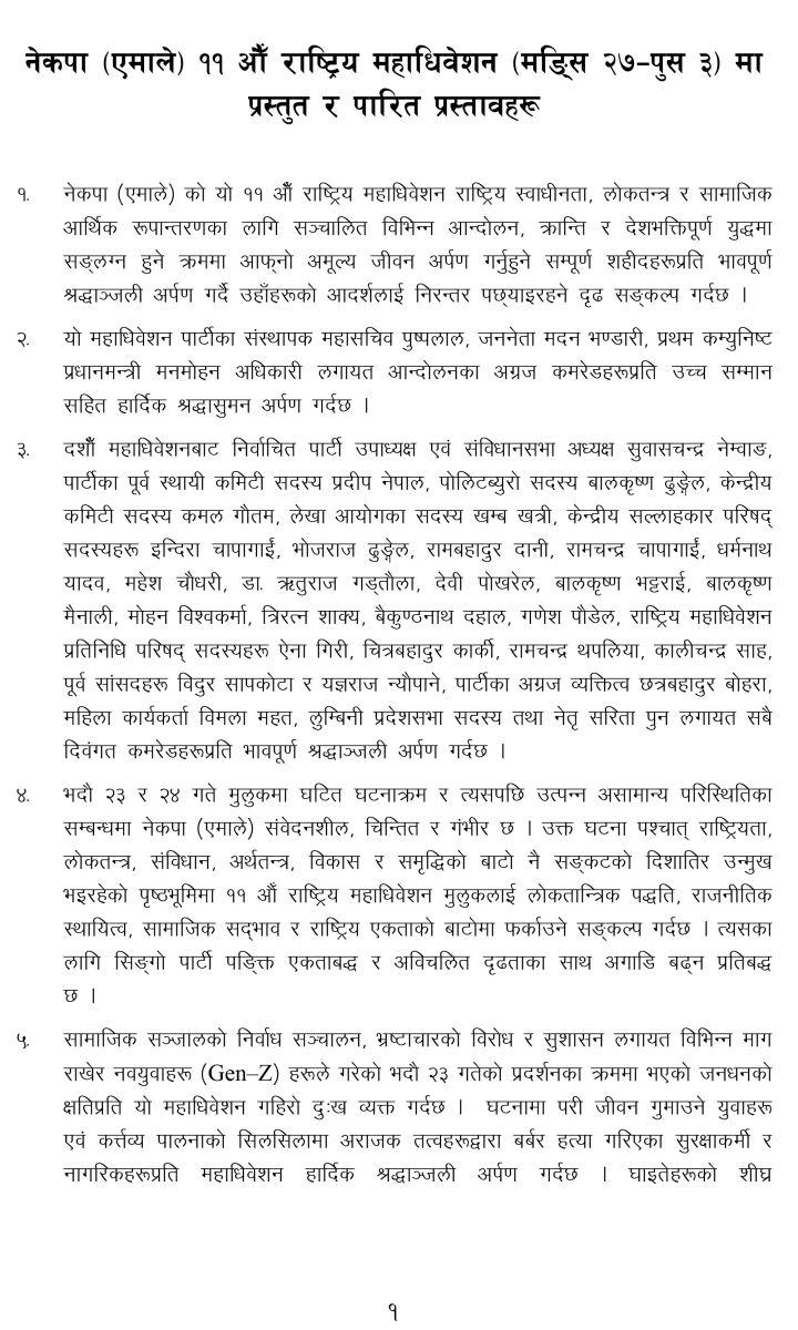 नेकपा एमालेको ११औँ राष्ट्रिय महाधिवेशनले मुलुक गम्भीर राजनीतिक, आर्थिक तथा सामाजिक संकटतर्फ उन्मुख भएको निष्कर्ष निकाल्दै लोकतान्त्रिक प्रक्रियामा फर्कन प्रतिनिधि सभा पुनर्स्थापनाको माग गरेको छ।