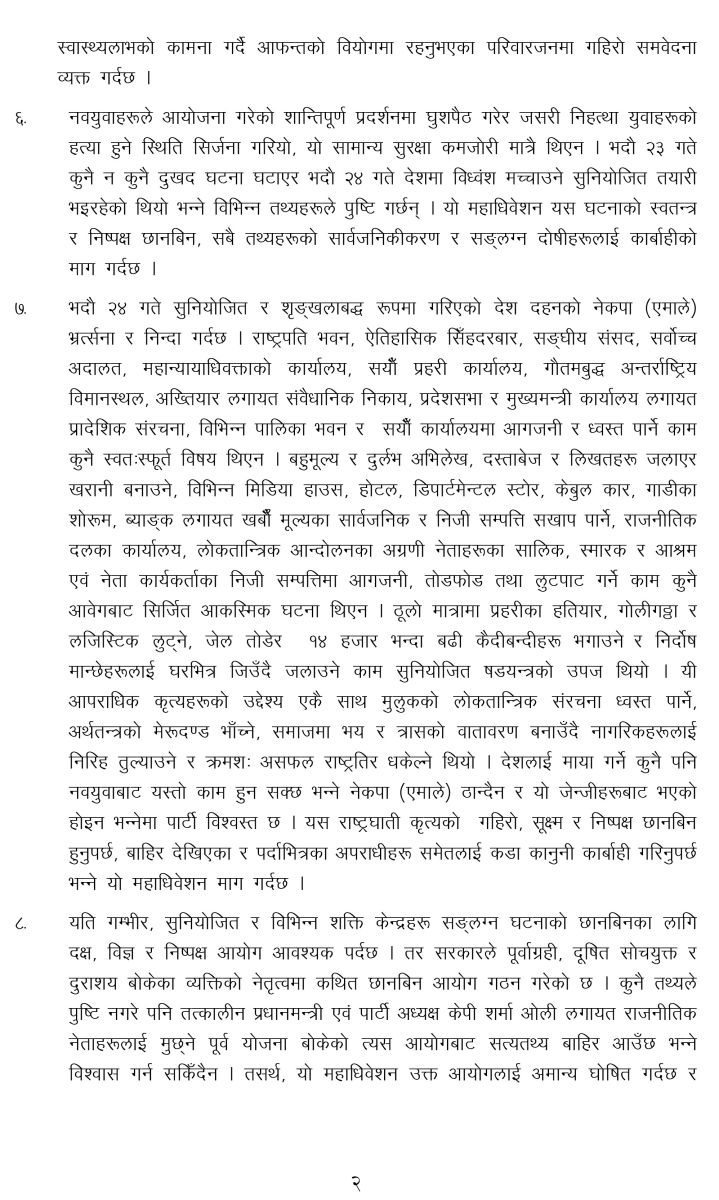 भदौ २३ र २४ गते देशका विभिन्न स्थानमा भएका हिंसात्मक घटनाको छानबिनका लागि गठित गौरीबहादुर कार्की नेतृत्वको छानबिन आयोगलाई अमान्य ठहर गर्ने अध्यक्ष केपी शर्मा ओलीको अडानलाई महाधिवेशनले प्रस्तावमार्फत औपचारिक मान्यता दिएको छ।