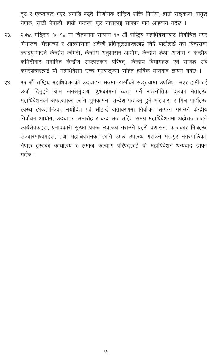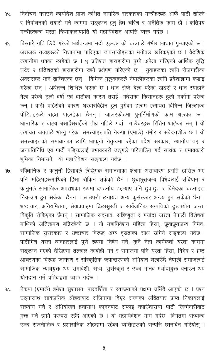 मंसिर २७ देखि पुस ३ गतेसम्म सम्पन्न महाधिवेशनले २४ बुँदे राजनीतिक प्रस्ताव पारित गर्दै वर्तमान सरकार असंवैधानिक, अलोकतान्त्रिक र दण्डहीनता संस्थागत गर्ने दिशामा अघि बढेको आरोप लगाएको छ। साथै, सरकारले निर्वाचनको वातावरण सिर्जना गर्न असफल भएको ठहर पनि प्रस्तावमा समेटिएको छ।