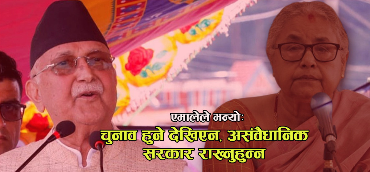 अब त्यसका लागि फागुन २१ को चुनाव पनि नपर्खने घोषणा नै ओलीले गरिसके। ‘कतिपय मानिसहरू भन्छन् फागुन २१ गते चुनाव भएन भने त्यसपछि संसद् पुनर्स्थापनाको माग गरौँला,’ ओलीले भने, ‘संसद् विघटन असंवैधानिक छ, गलत छ, गैर कानुनी छ, अलोकतान्त्रिक छ। यो देश हितका विरुद्धमा छ, हामीलाई थाहा छैन र? किन पर्खनुप¥यो फागुन २१ गते? पर्खनु परेको छैन।’ यसमा अब नेपाली जनताले आँधी तुफान सिर्जना गरेर अघि बढ्ने उनले दाबी गरे।
