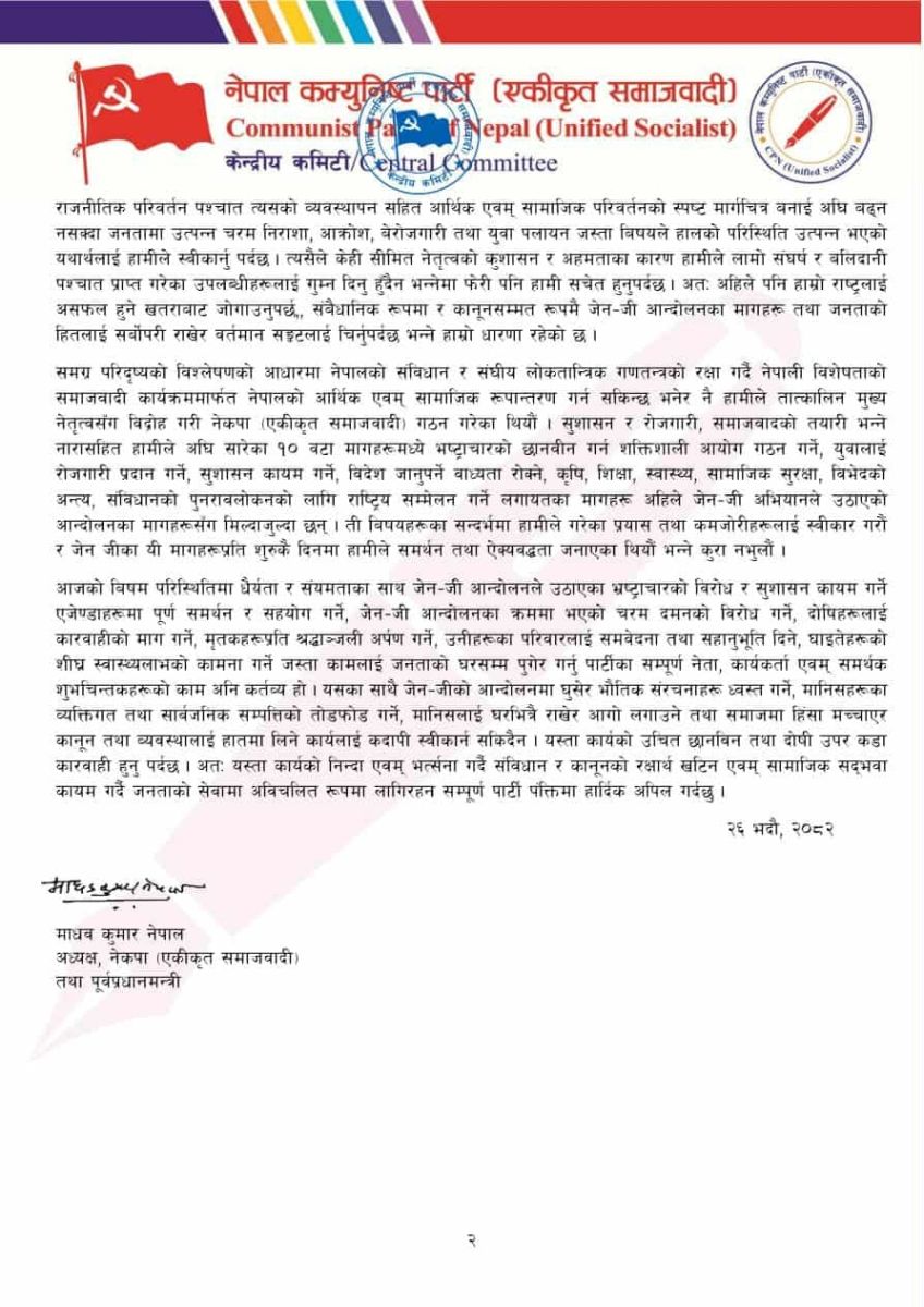 नेपाल कम्युनिष्ट पार्टी (एकीकृत समाजवादी) का अध्यक्ष माधवकुमार नेपालले जेनजी आन्दोलनका मागहरूलाई समर्थन गर्दै पार्टीको आधिकारिक धारणा सार्वजनिक गरेका छन्।
