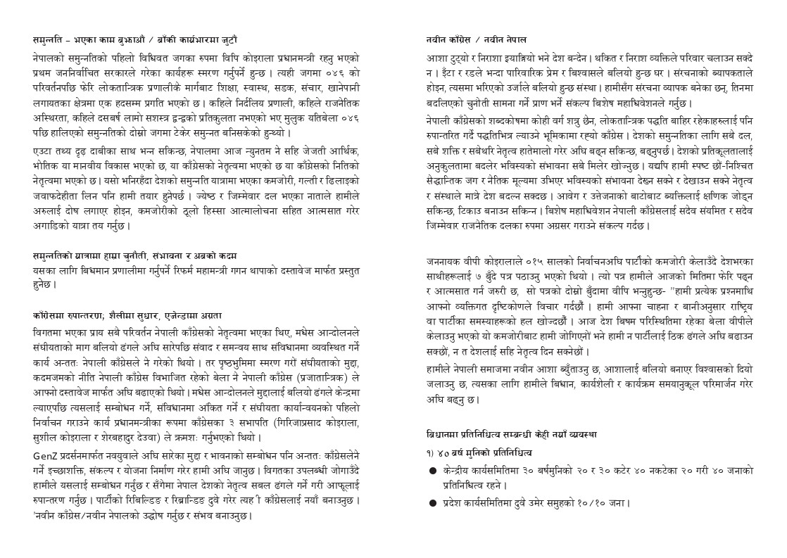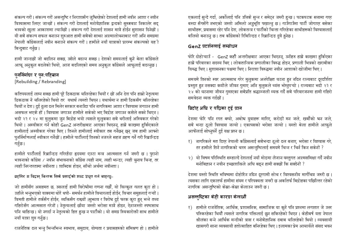 महामन्त्री विश्वप्रकाश शर्माले जेनजी आन्दोलनको नेतृत्व गर्ने जेनजी आन्दोलनकारीले आन्दोलनको आत्मसमीक्षा गर्दै आफ्नो भागको जिम्मा लिनुपर्ने बताएका छन्। काठमाडौंमा जारी कांग्रेस विशेष महाधिवेशनमा सोमबार सांगठनिक प्रतिवेदन प्रस्तुत गर्दै जेनजी प्रदर्शनकारीले पनि आफ्नो प्रदर्शनको आत्मसमीक्षा गर्नुपर्ने उल्लेख गरेका छन्।