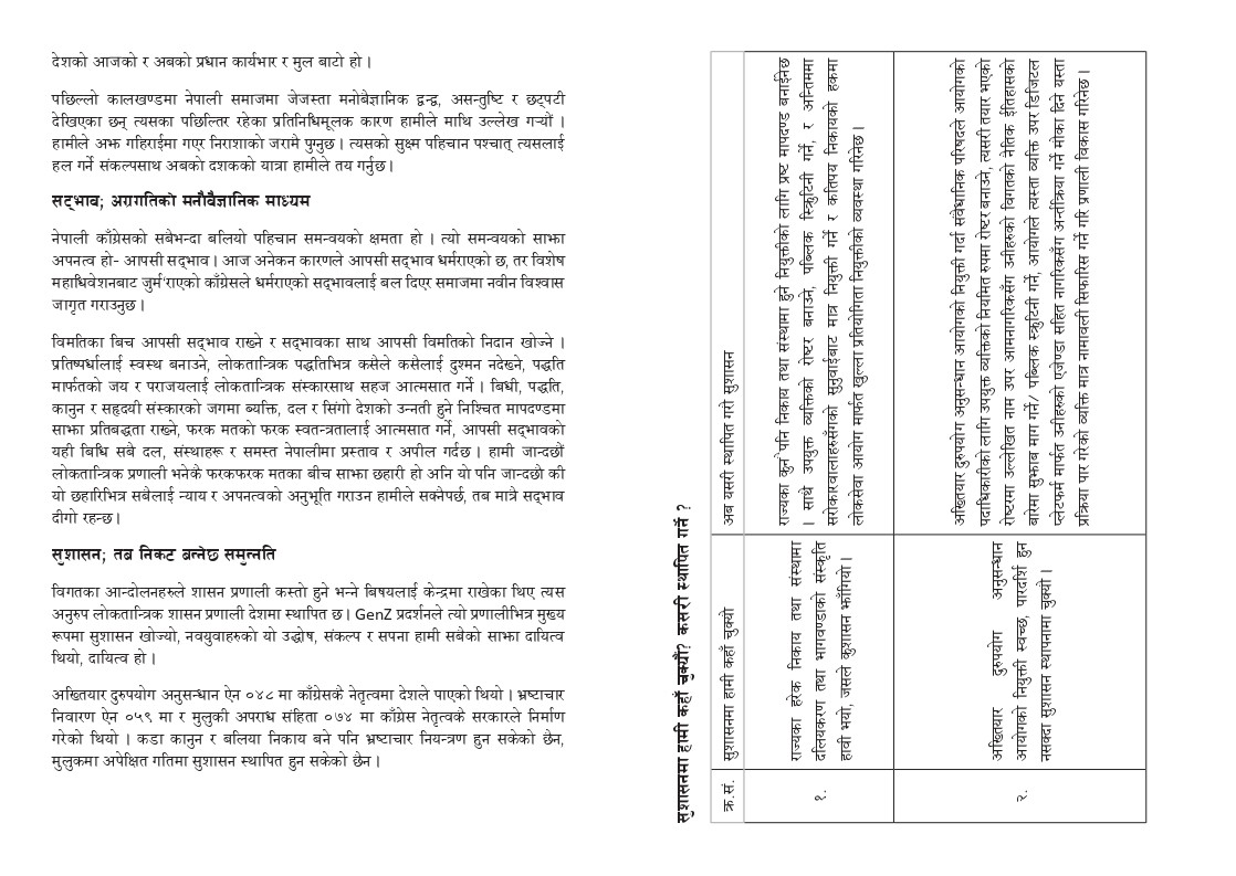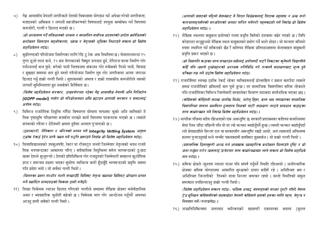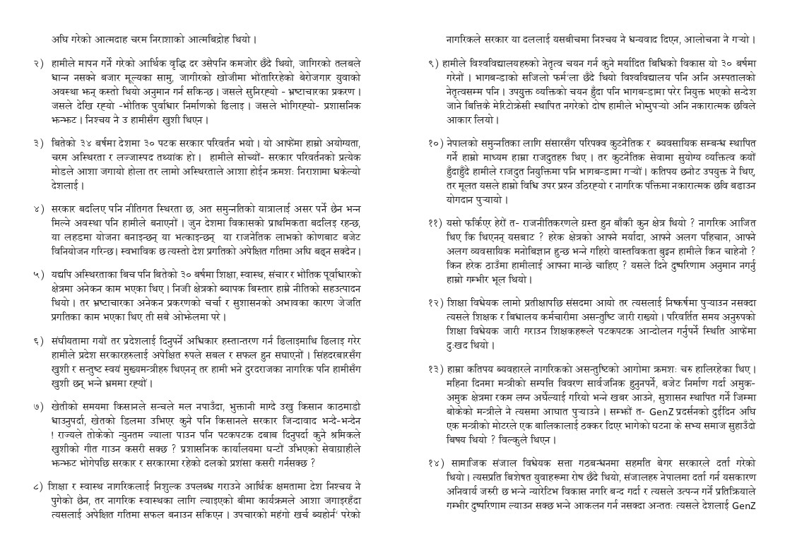 प्रतिवेदनमा भदौ २३ र २४ गतेका घटनालाई सम्बोधन गर्दै उनले भने, ‘फेरि दोहोर्याउँ–जेनजी कहीँ अन्तरिक्षबाट आएका थिएनन्, उनीहरू हाम्रै काखमा हुर्किएका, हाम्रै परिवारका सदस्य थिए। लोकतान्त्रिक प्रणालीका विरुद्ध होइन, प्रणालीभित्रको खराबीका विरुद्ध थिए। सुशासनका पक्षमा थिए। निराशाविरुद्ध नवीन आशाको खोजीमा थिए।’