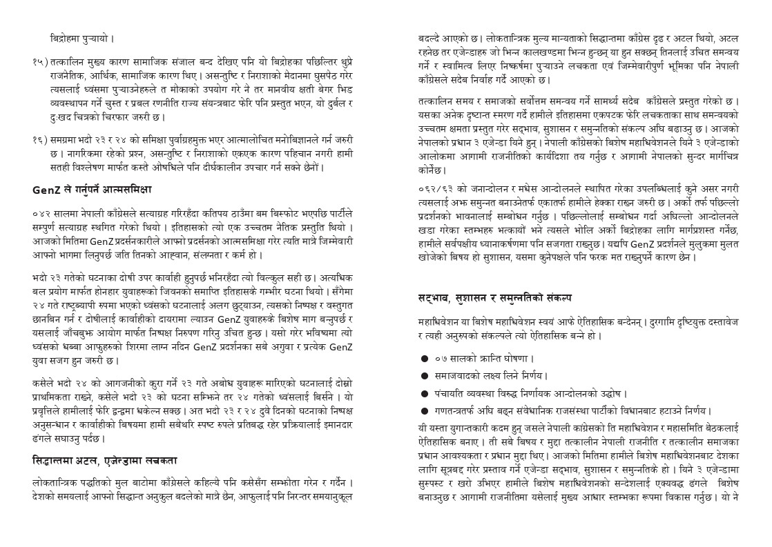 उनले भनेका छन्, ‘०४२ सालमा नेपाली कांग्रेसले सत्याग्रह गरिरहँदा कतिपय ठाउँमा बम बिस्फोट भएपछि पार्टीले सम्पूर्ण सत्याग्रह स्थगित गरेको थियो। इतिहासको त्यो एक उच्चतम नैतिक प्रस्तुति थियो। आजको मितिमा जेनजी प्रदर्शनकारीले आफ्नो प्रदर्शनको आत्मसमीक्षा गरेर त्यति मात्रै जिम्मेवारी आफ्नो भागमा लिनुपर्छ जति तिनको आह्वान, संलग्नता र कर्म हो।’