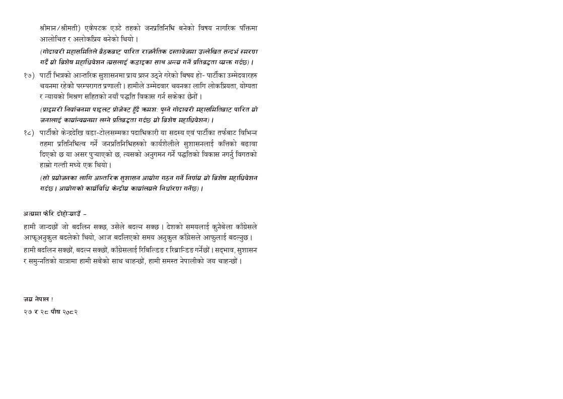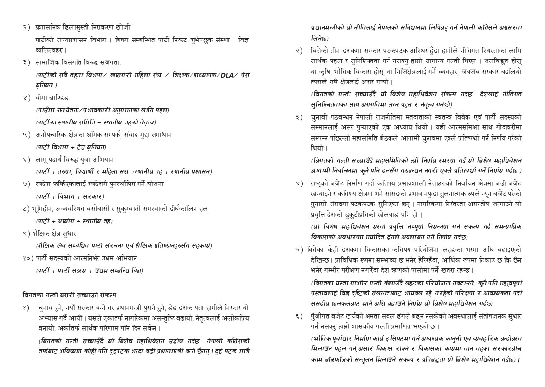 नेपाली कांग्रेसका महामन्त्री विश्वप्रकाश शर्माले पार्टीले विगतमा गरेको कामको सम्बन्धमा १८ बुँदे आत्मालोचना गरेका छन्। कांग्रेसको दोस्रो विशेष महाधिवेशन अन्तर्गत सोमबार बन्दसत्रमा आफ्नो प्रतिवेदन प्रस्तुत गर्दै उनले यस्तो आत्मालोचना गरेका हुन्।