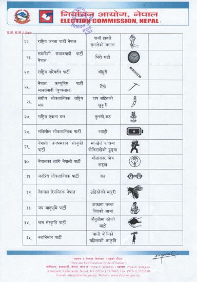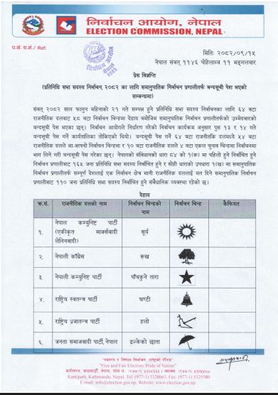 निर्वाचन आयोगमा आसन्न प्रतिनिधिसभा सदस्य निर्वाचनका लागि समानुपातिक प्रणालीतर्फको बन्द सूची पेस गर्ने राजनीतिक दल र निर्वाचन चिह्नको विवरण सार्वजनिक भएको छ ।