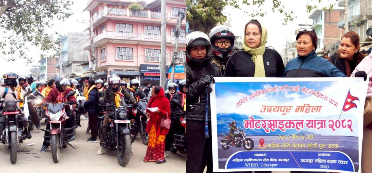उदयपुरका जेन–जेड महिलाहरुको एक समूहले मोटरसाईकल यात्रा गरेको छन् । ‘महिला सशक्तीकरण, आत्मनिर्भरता र समान अधिकार’को सन्देश फैलाउन मङ्गलबार जेनजेड महिला टोलीले मोटरसाईकल यात्रा सम्पन्न गरेको हो ।