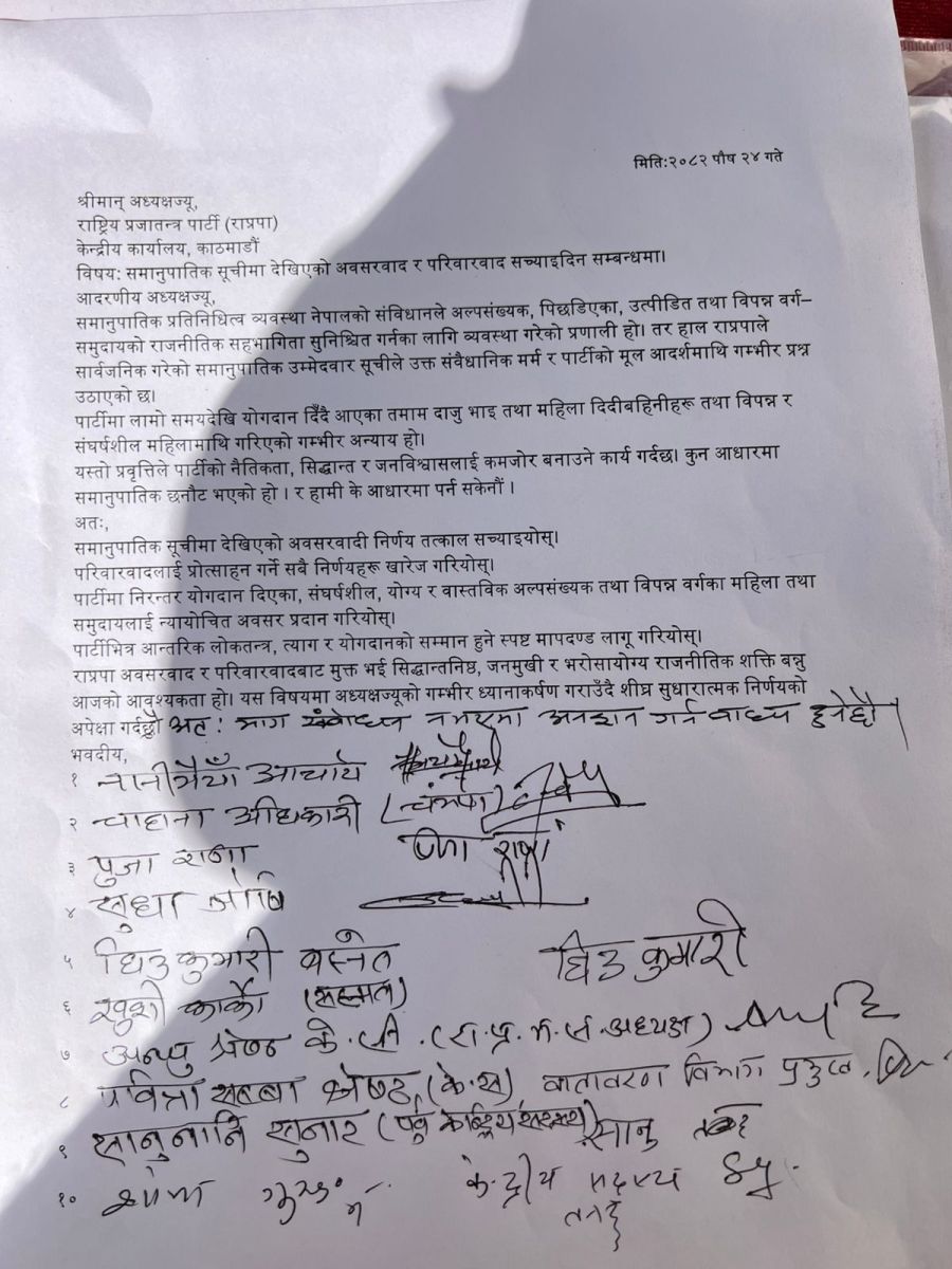 समानुपातिक निर्वाचन प्रणालीअन्तर्गत तयार पारिएको बन्दसूचीलाई लिएर राष्ट्रिय प्रजातन्त्र पार्टी (राप्रपा) भित्र असन्तुष्टि चुलिँदै गएको छ। बन्दसूची सच्याउन माग गर्दै महिलाहरूको एक समूह आज पार्टी केन्द्रीय कार्यालय पुगेको हो।