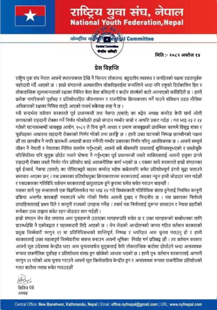 नेकपा (एमाले) निकट राष्ट्रिय युवा संघ नेपालले सरकारलाई आगामी प्रतिनिधिसभा निर्वाचन शान्तिपूर्ण, निष्पक्ष र भयरहित वातावरणमा सम्पन्न गर्न पूर्ण रूपमा केन्द्रित हुन आग्रह गरेको छ। संघका अध्यक्ष क्षितिज थेबेले मंगलबार जारी गरेको प्रेस विज्ञप्तिमा संगठनले सरकारलाई उक्त जिम्मेवारीमा सफल बनाउन तयार रहेको उल्लेख गर्दै राजनीतिक प्रतिशोधका गतिविधि तत्काल रोक्न चेतावनी दिएको छ।