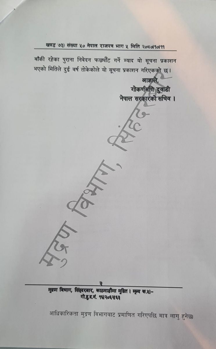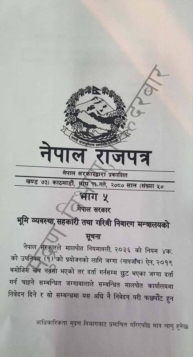 यसैबिच, मन्त्रालयले बिहीबार राजपत्रमा निकालेको सूचनामा भनिएको छ, ‘नेपाल सरकारले मालपोत नियमावली, २०३६ को नियम ४ (क) को उपनियम (१) को प्रयोजनको लागि जग्गा (नाप जाँच) ऐन, २०१९ बमोजिम नाप नक्सा भएको तर दर्ता गर्नसम्म छुट भएका जग्गा दर्ता गर्न चाहने सम्बन्धित जग्गावालाले सम्बन्धित मालपोत कार्यालयमा निवेदन दिने र सो सम्बन्धमा यस अघि नै निवेदन परी फर्छ्यौट हुन बाँकी रहेका पुराना निवेदन फर्छ्यौट गर्ने म्याद यो सूचना प्रकाशन भएको मितिले दुई वर्ष तोकेकोले यो सूचना प्रकाशन गरिएको छ।’