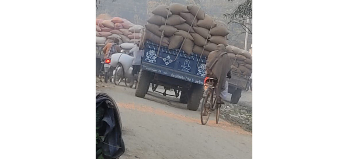 तस्करीका सामान बोकेर बेल्हीतर्फ आउँदै नम्बर प्लेटविनाका ट्र्याक्टर। तस्बिर : नागरिक