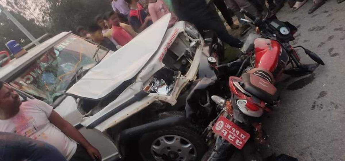 एम्बुलेन्स र मोटरसाइकल एकआपसमा ठोक्किँदा मोटरसाइकल चालकको मृत्यु भएको छ भने मोटरसाइकलमा सवार अर्का व्यक्ति घाइते छन्।