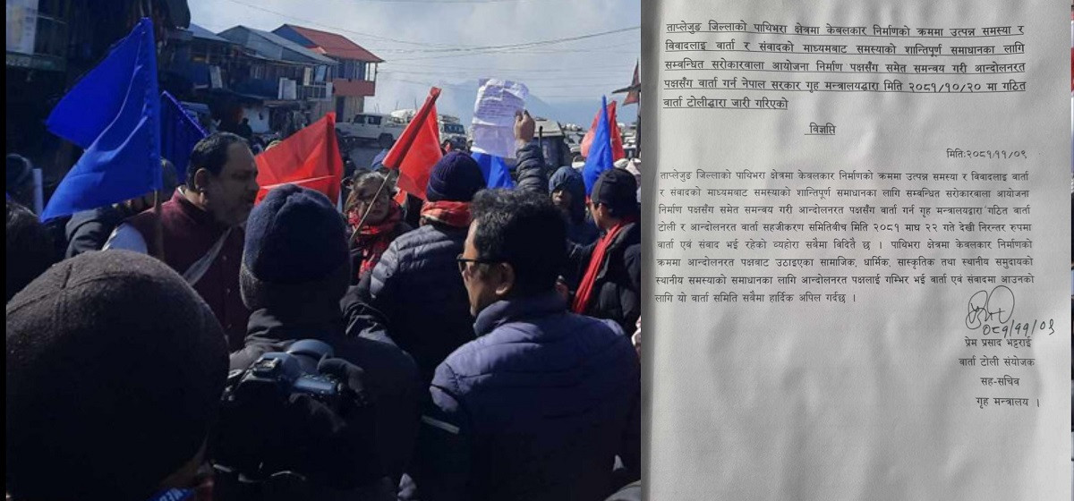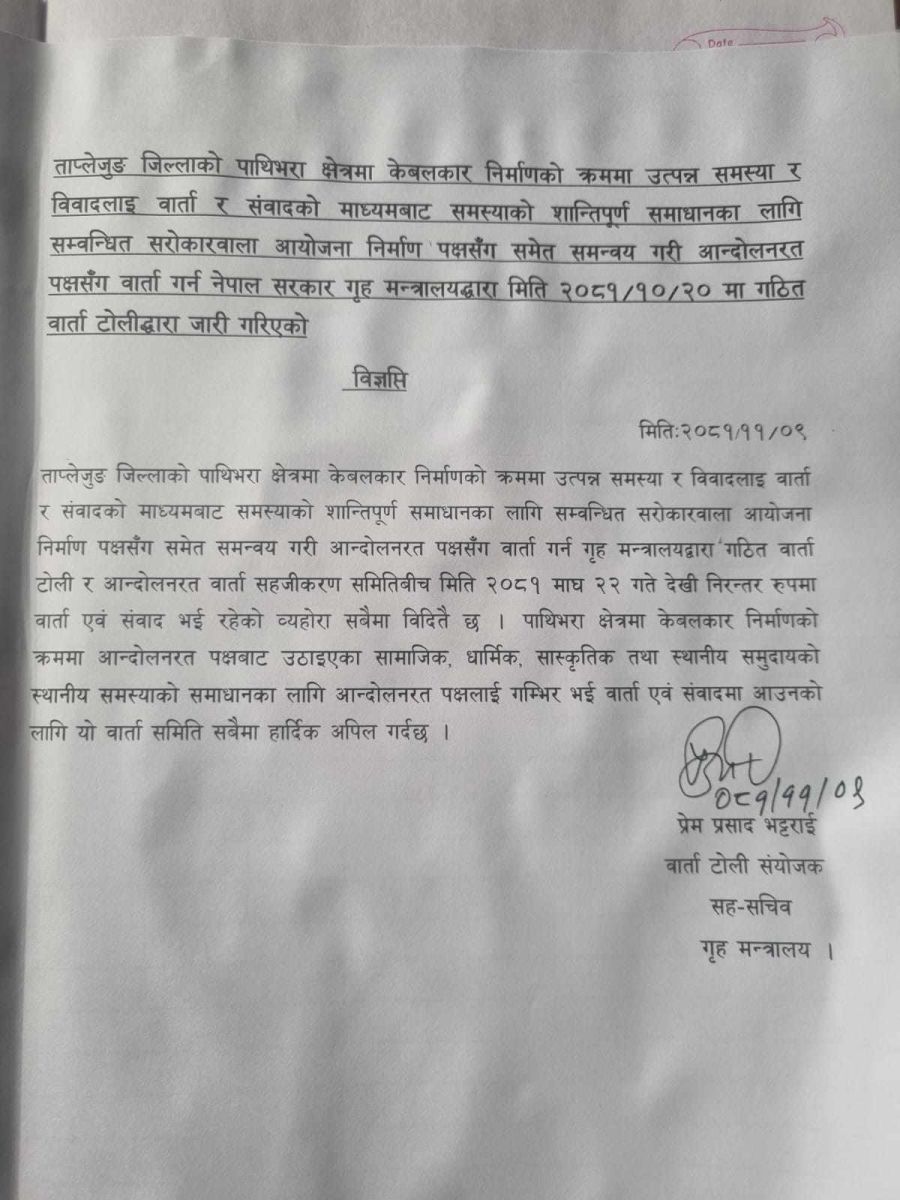 'पाथीभरा क्षेत्रमा केबलकार निर्माणको क्रममा आन्दोलनरत पक्षबाट उठाइएका सामाजिक, धार्मिक, सांस्कृतिक तथा स्थानीय समुदायको स्थानीय समस्याको समाधानका लागि आन्दोलनरत पक्षलाई गम्भीर भई वार्ता एवं संवादमा आउनको लागि यो वार्ता समिति सबैमा हार्दिक अपिल गर्दछ,' विज्ञप्तिमा भनिएको छ।