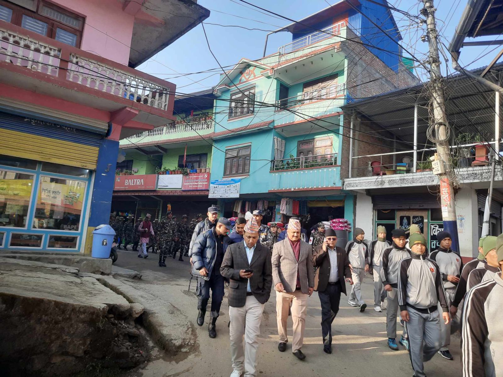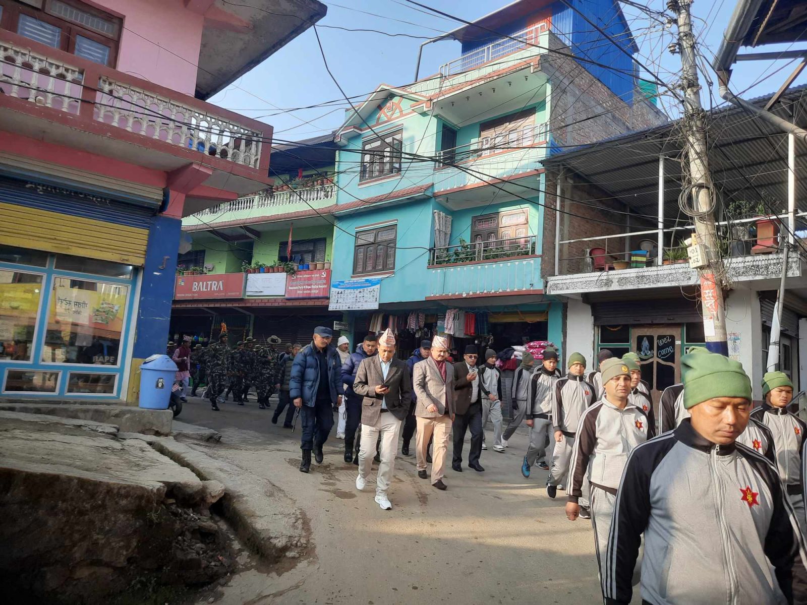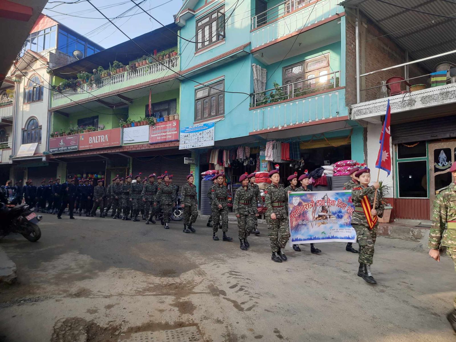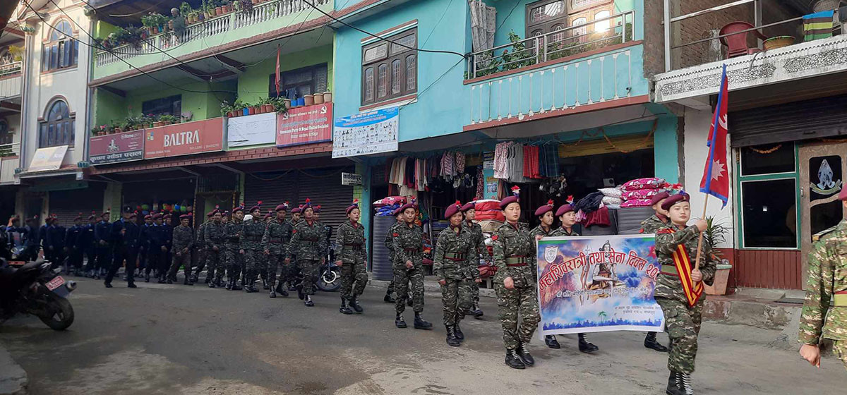 नेपाली सेना, नेपाल प्रहरी, सशस्त्र प्रहरी र राष्ट्रिय सेवा दल ( एनसिसी) को टोलीले ब्याण्ड बाजा हित मार्चपास गर्दै सिद्धिडाँडा पुगेर सलामी अर्पण गरेको हो। कार्यक्रममा प्रमुख जिल्ला अधिकारी नेत्रप्रसाद शर्मा, दुर्गादल गुल्मका गुल्मपति सेनानी विक्रम खड्का, जिल्ला प्रहरी प्रमुख डिएसपी रवि रावल, सशस्त्र प्रहरी वल नेपाल नं १ गुल्म कञ्चनजंघा हेडक्वाटरका गुल्मपति सशस्त्र प्रहरी नायव उपरीक्षक नरेश मर्हजन सहितको सहभागिता छ।