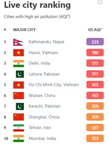 भारतको दिल्ली, पाकिस्तानको लाहोर र भियतनामको हनोई जस्ता सहरहरूलाई काठमाडौंले पछाडि पारेको छ। दोस्रो स्थानमा हनोई (१८०), तेस्रोमा दिल्ली (१७७) र चौथोमा लाहोर (१७७) परेका छन्। त्यस्तै, भियतनामको हो चि मिन्ह सिटी (१५५) पाँचौं स्थानमा छ। चीनको वुहान (१५३) छैटौँ स्थानमा छ।