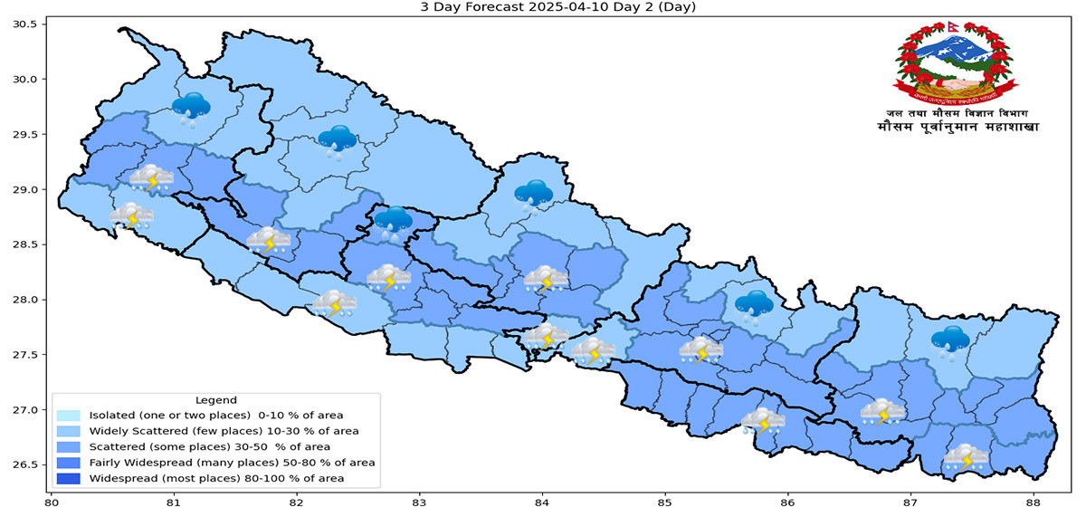 जल तथा मौसम पूर्वानुमान महाशाखाका अनुसार आज कोशी र मधेस प्रदेश, बागमती, गण्डकी, लुम्बिनी प्रदेशका पहाडी भू–भागका केही स्थानमा मेघगर्जन र चट्याङसहित हल्कादेखि मध्यम वर्षा हुनसक्ने छ। देशका उच्च पहाडी तथा हिमाली भागका केही स्थानहरूमा हल्का वर्षा एवं हिमपात पनि हुनसक्ने छ।