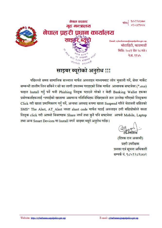 ब्यूरोले प्राप्त त्यस्ता लिङ्कहरू क्लिक तथा इन्स्टल नगर्नसमेत भनेको छ।