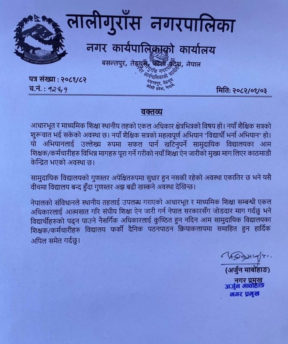 नगरप्रमुख मावोहाङले विद्यार्थीको पढ्न पाउने नैसर्गिक अधिकार कुण्ठित हुन नहुने भन्दै आम सामुदायिक बिद्यालयका शिक्षक तथा कर्मचारीलाई विद्यालयमा फर्किएर दैनिक पठनपाठन क्रियाकलापमा समाहित हुन अपिल समेत गरेका छन्।