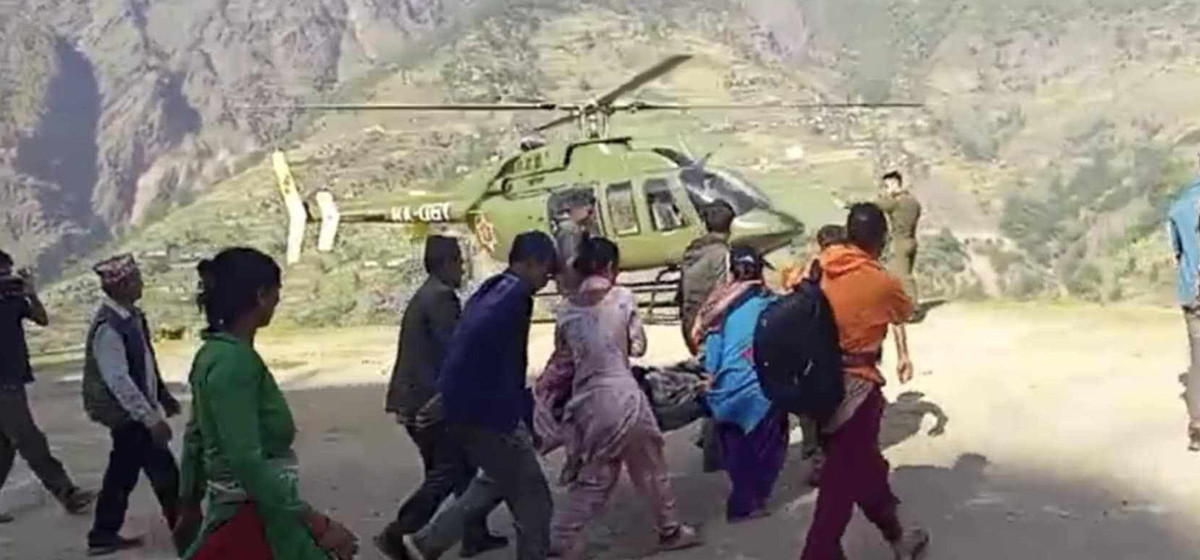 कालीकोटको नरहरिनाथ गाउँपालिका–७, माल्कोटकी ३० वर्षीया घुमीसरा शाहीलाई सुत्केरी व्यथा लागेपछि हेलिकप्टरमार्फत उद्धार गरी सुर्खेत पठाइएको छ।