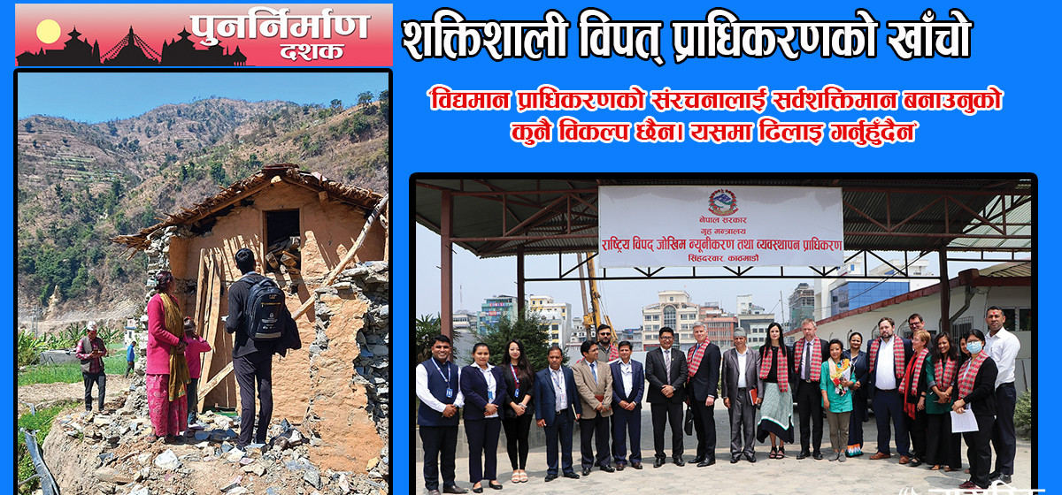 ‘सबैभन्दा महत्त्वपूर्ण कुरा के हो भने विपत् भनेको राहत र उद्धार मात्र होइन, यो पुनर्निर्माण र पुनर्लाभसँग प्रत्यक्ष जोडिएको विषय हो,’ उनी भन्छन्। उनका अनुसार अहिलेको सबैभन्दा ठुलो आवश्यकता बलियो र शक्तिशाली प्राधिकरणको स्थापना हो, जसले सिधै प्रधानमन्त्री कार्यालयअन्तर्गत रहेर काम गर्नेछ। प्राधिकरणका पूर्वप्रमुख पोखरेल पनि प्राधिकरणलाई सशक्त पार्ने देशमा राजनीतिक तहमा एक प्रकारको सहमति रहेको दाबी गर्छन्। ‘विद्यमान प्राधिकरणको संरचनालाई सर्वशक्तिमान बनाउनुको कुनै विकल्प छैन। यसमा ढिलाइ गर्नुहुँदैन,’ उनी भन्छन्।