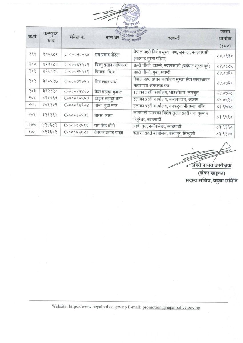 नेपाल प्रहरीको जनपद प्रहरी समूहअन्तर्गत प्रहरी नायब निरीक्षक (सई) पदमा २०८ जना प्रहरी सहायक निरीक्षकलाई बढुवाका लागि सिफारिस गरिएको छ।