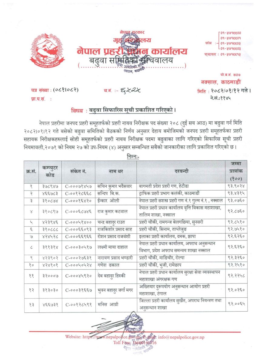 प्रहरी प्रधान कार्यालय, नक्सालस्थित बढुवा समितिको २०८२ वैशाख १२ गतेको बैठकले प्रहरी नियमावली, २०७१ को नियम २७ को उपनियम (४) बमोजिम यो सिफारिस गरेको हो।