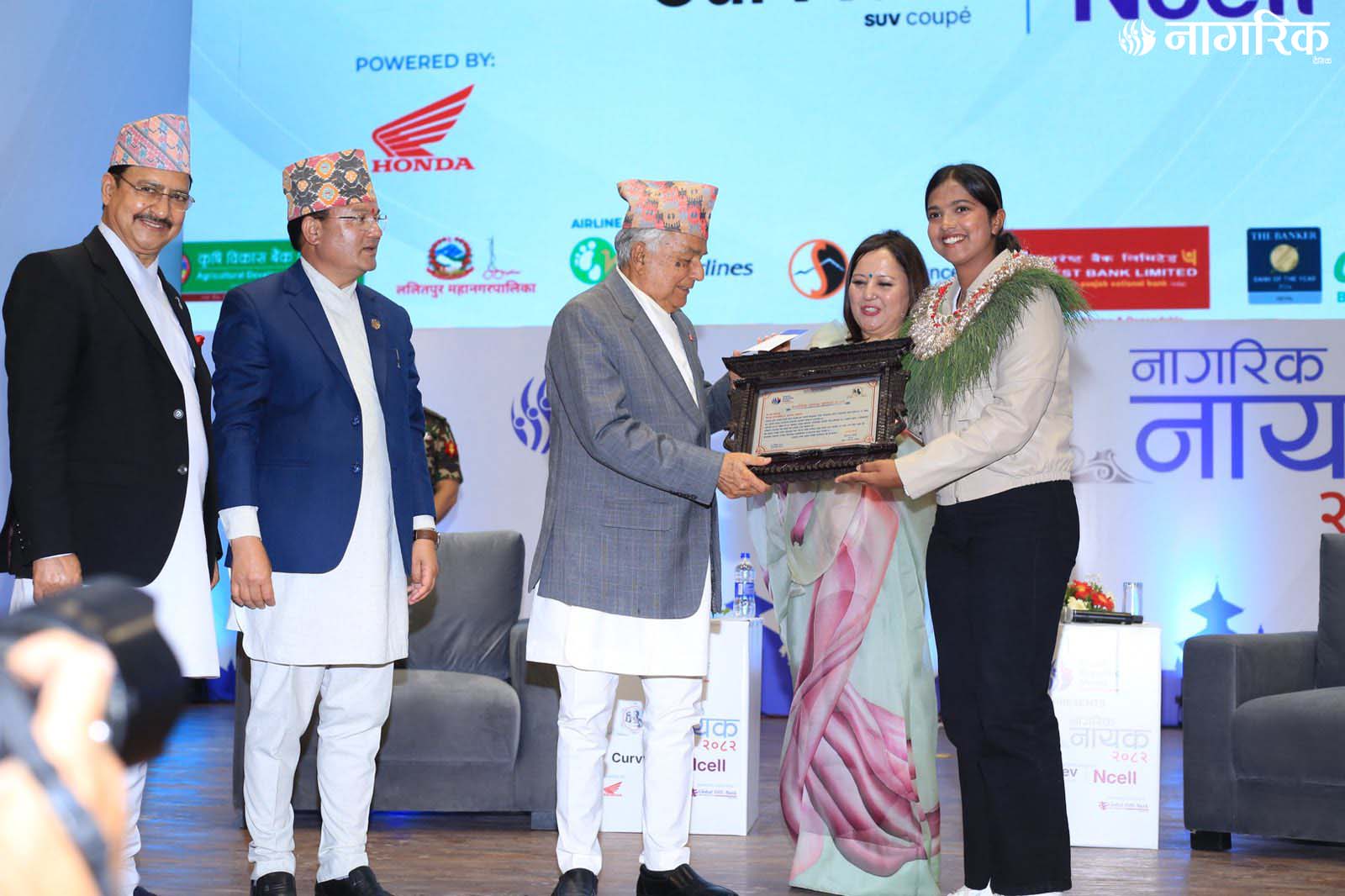 शनिबार नेपाल पुलिस क्लबमा आयोजित विशेष समारोहमा राष्ट्रपति रामचन्द्र पौडेलले कैलालीकी वन संरक्षण अभियन्ता नन्दादेवी कुँवर, बुटवलका शिक्षक घनश्याम पाठक र युवा महिला क्रिकेटर पूजा महतोलाई सम्मान प्रदान गरे।
