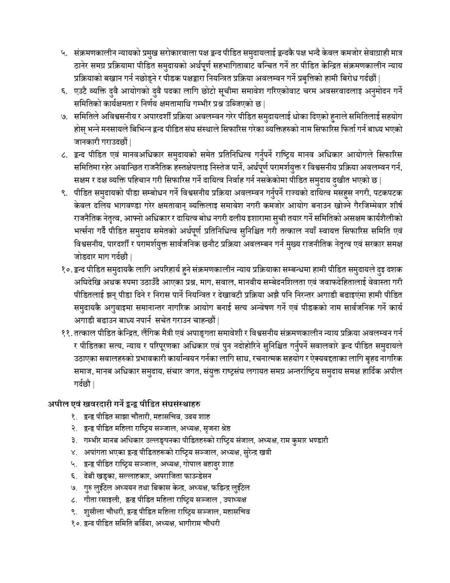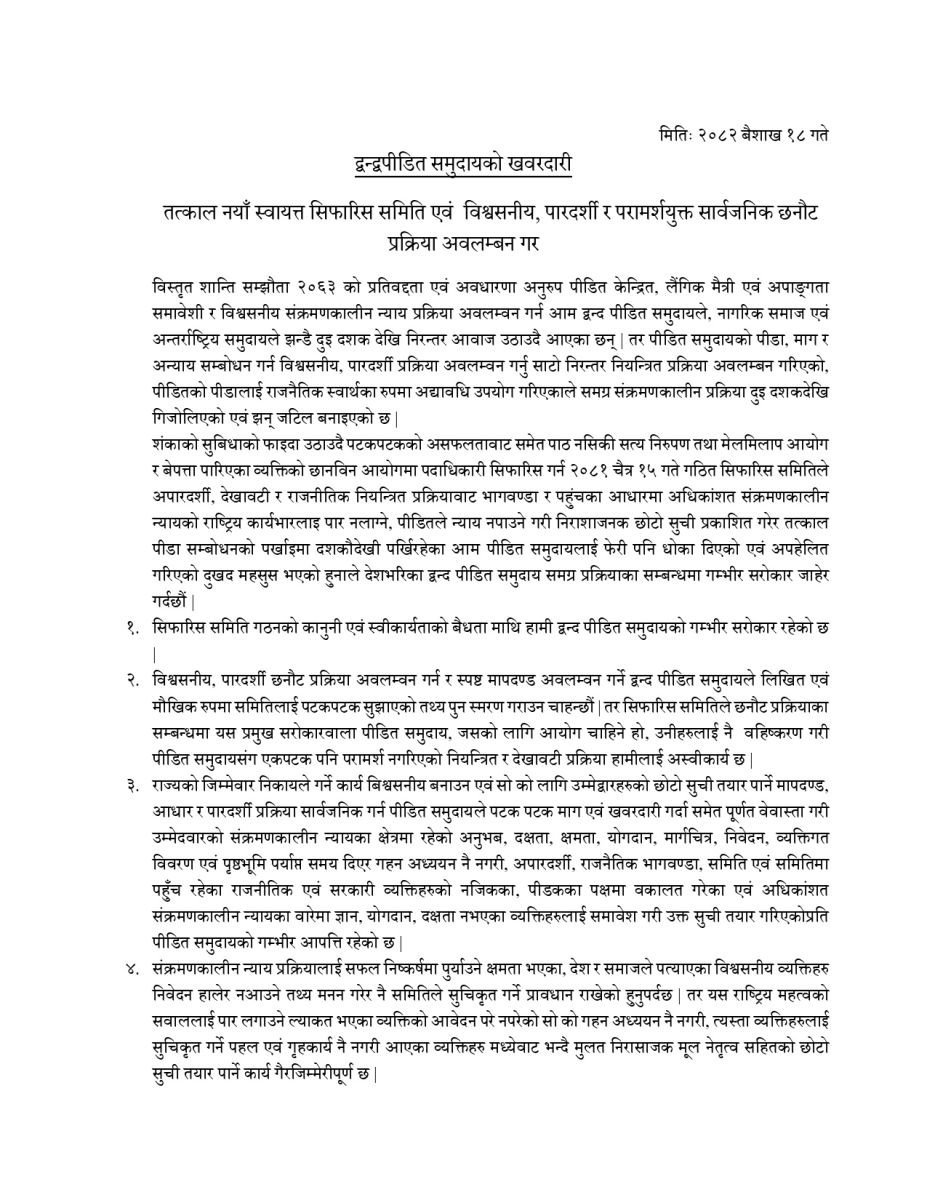 द्वन्द्वपीडित समुदायले सङ्क्रमणकालीन न्यायसम्बन्धी दुई आयोगका अध्यक्ष तथा पदाधिकारी सिफारिस समितिले अपारदर्शी, देखावटी, राजनीतिक भागबन्डा र पहुँचका आधारमा पदाधिकारीको सूची तयार पारेको भन्दै असन्तुष्टि व्यक्त गरेका छन्।