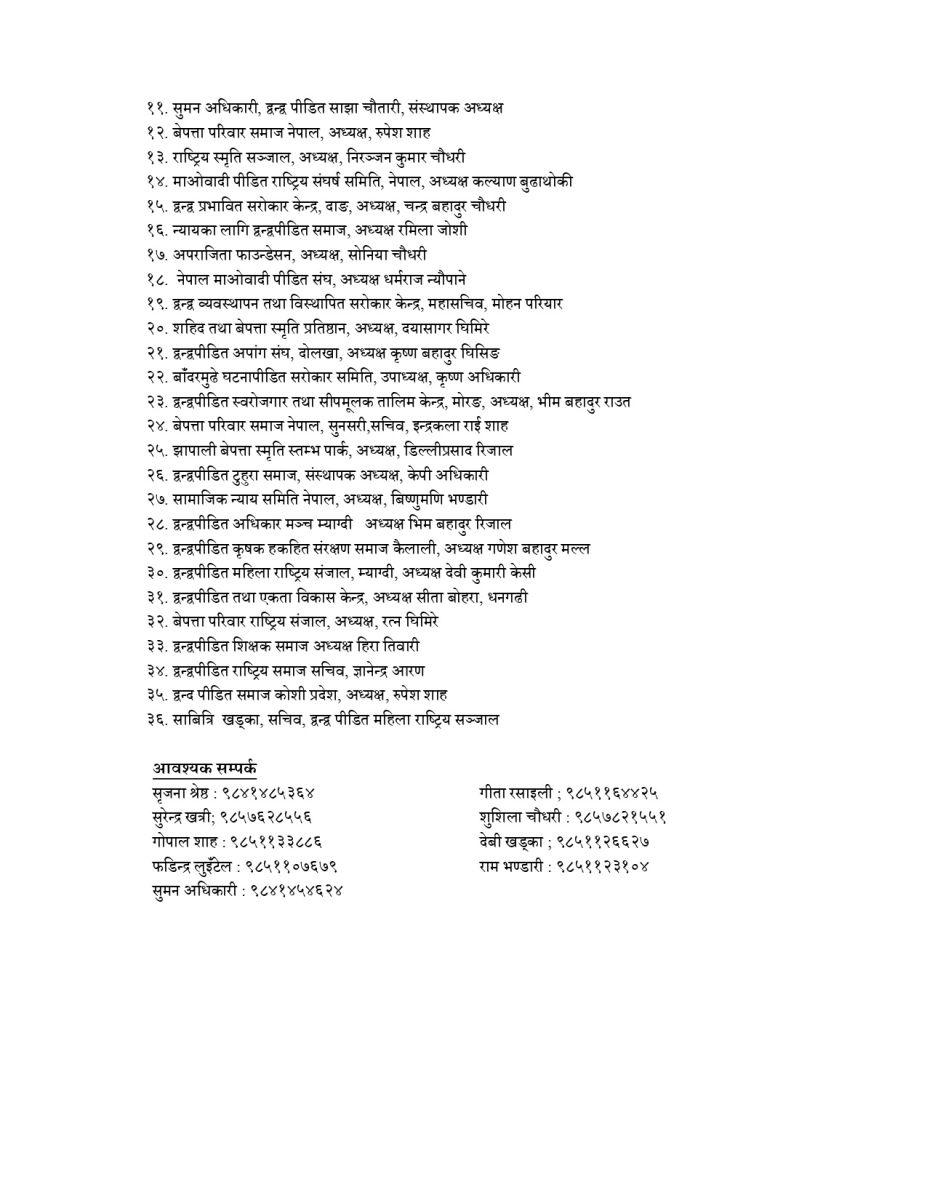 पीडितहरूको सहभागिता र आफूहरूको माग र मुद्दाको सन्दर्भमा राजनीतिक दलका नेतृत्व र सरकार जिम्मेवार नबनेको खण्डमा सत्य अन्वेशन गर्नेगरी नागरिक तहमा समानन्तर आयोग गठन गर्ने पनि उनीहरूको चेतावनी छ।