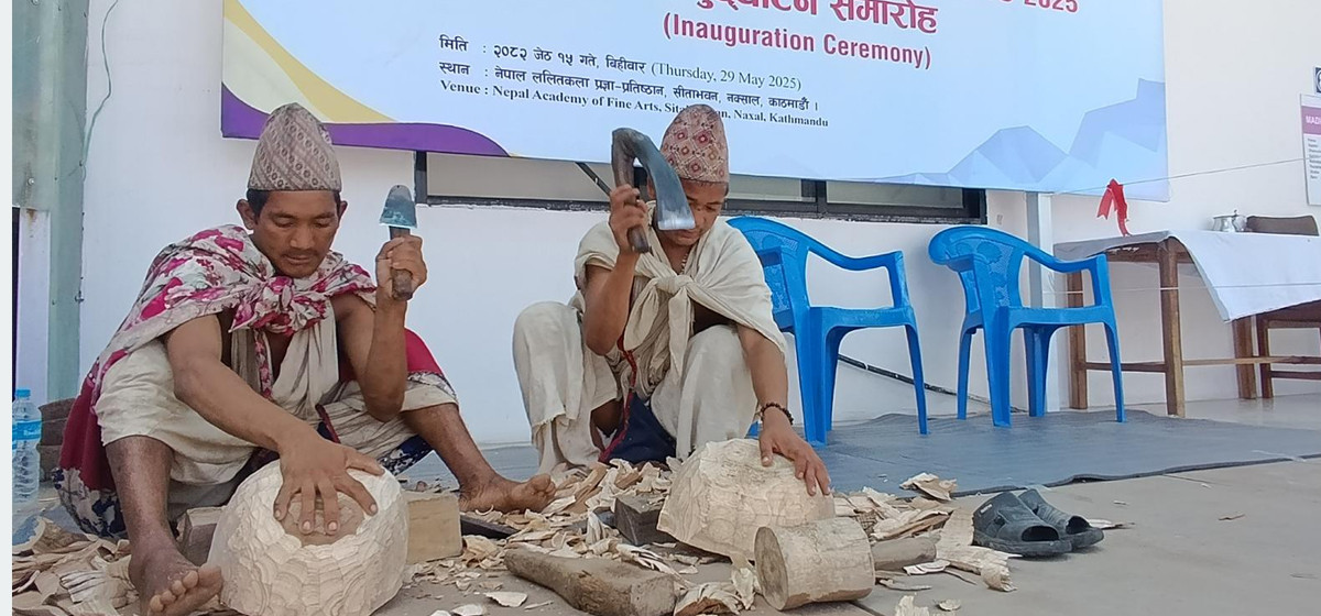 नेपाल ललितकला प्रज्ञा प्रतिष्ठानको एक छेउमा सुर्खेतबाट आएका राउटे दीपक शाही बसिलाले टुनीको काठमा आकार दिँदै छन्। उनको छेवैमा धयर शाही पनि टुनीको ठेउकोलाई आकारमा ढाल्दै छन्। उनीहरुका साथमा राउटे समुदायकि महिला बाटुली र सुरमानी कपडामा बुट्टा भर्दै छिन्।