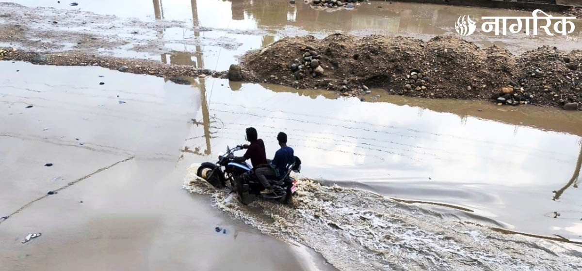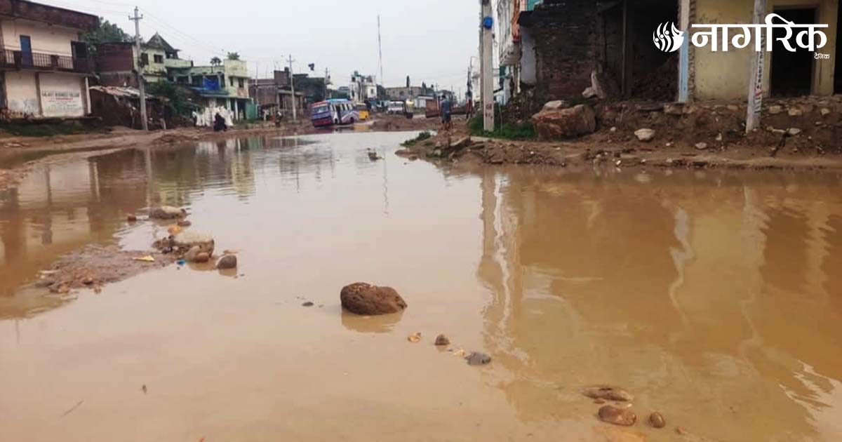 सामान्य वर्षाले पनि कलैया बजार क्षेत्रको निर्माणाधीन हुलाकी सडकखण्ड पोखरीमा परिणत भएको छ।