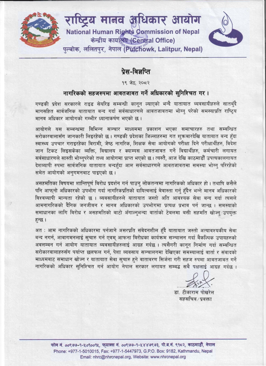 सोमबार एक विज्ञप्ति जारी गर्दै आयोगले आम नागरिकको अधिकारमा पर्न जाने असरप्रति संवेदनशील हुन यातायात व्यवसायीलाई आग्रह गरेको हो।